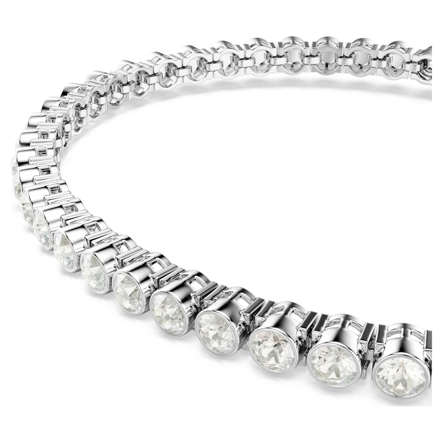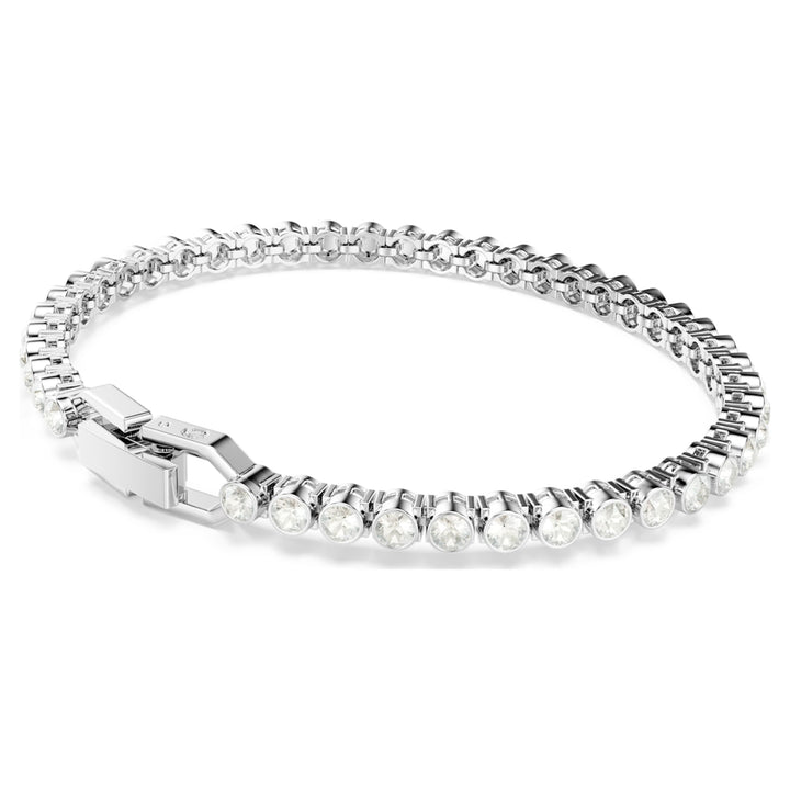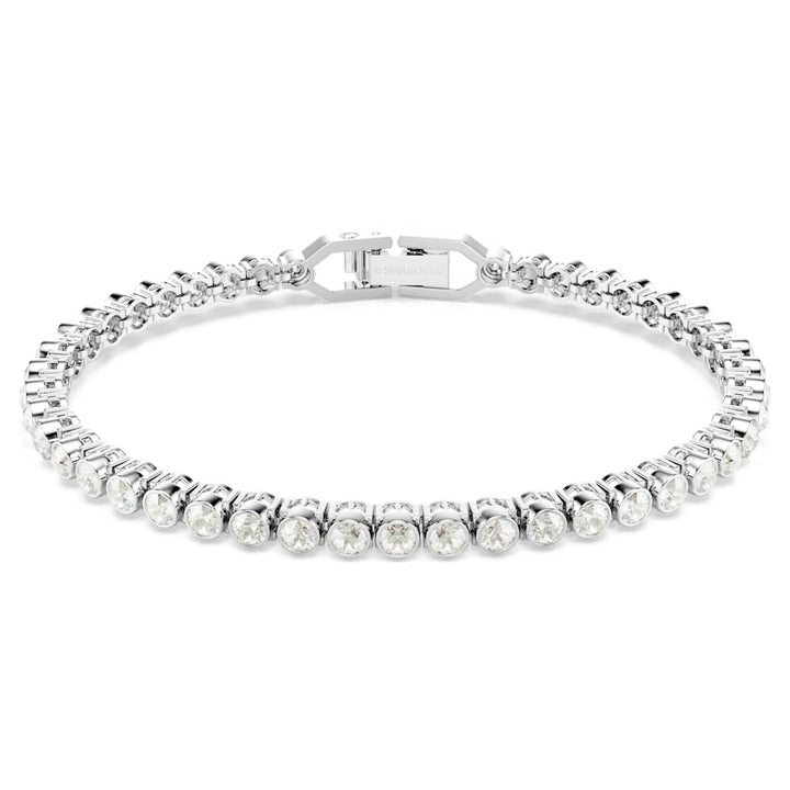 This Imber Emily Tennis Bracelet by Swarovski is a classic with a glow that speaks volumes, offering a contemporary take on a timeless silhouette. The rhodium-plated design features a delicate, flexible strand of bezel-set crystals in a sophisticated silver-tone gray. Its elegant and minimalistic aesthetic makes a bold statement of refined luxury around the wrist. Finished with a secure foldover clasp and a practical extender for a customized fit, this bracelet is designed to accentuate your style at any time of day or night, whether worn solo or stacked.