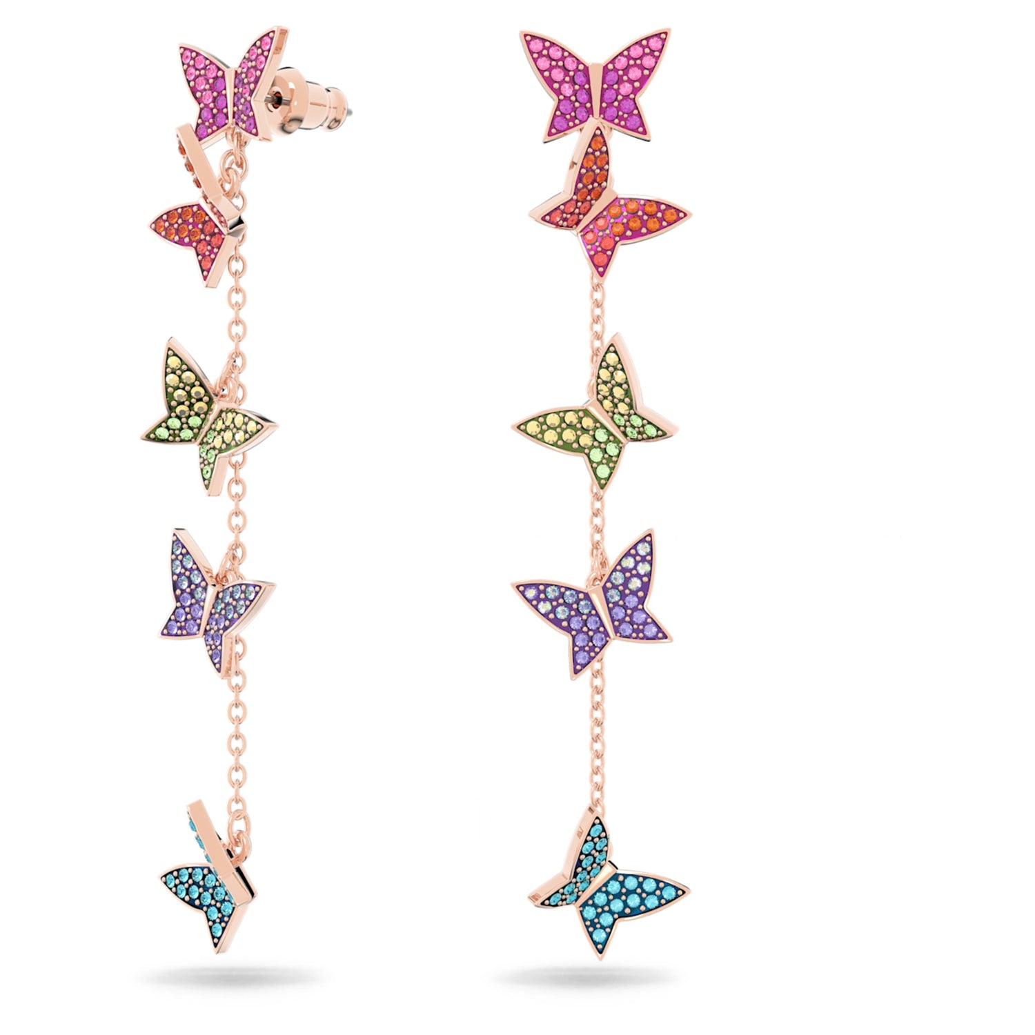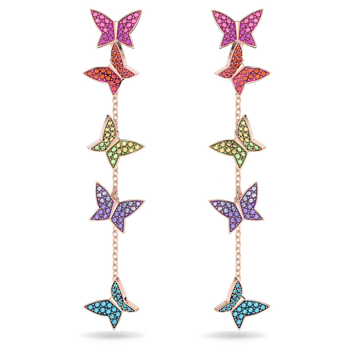 These rose gold-tone drop earrings feature multicolored rainbow crystal pavé on butterfly motifs with long, dangling chain accents.