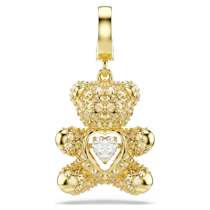 This gold-tone plated charm features a teddy bear motif with a central dancing stone and crystal embellishments.