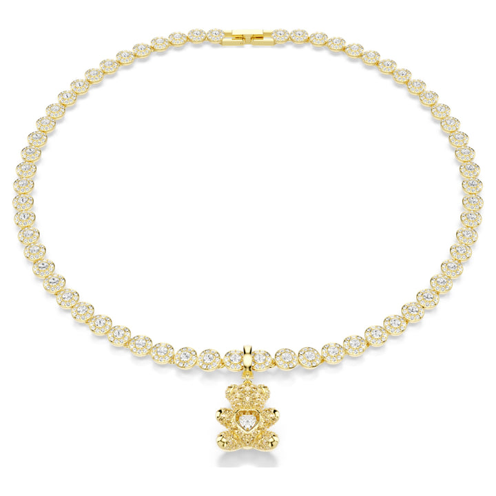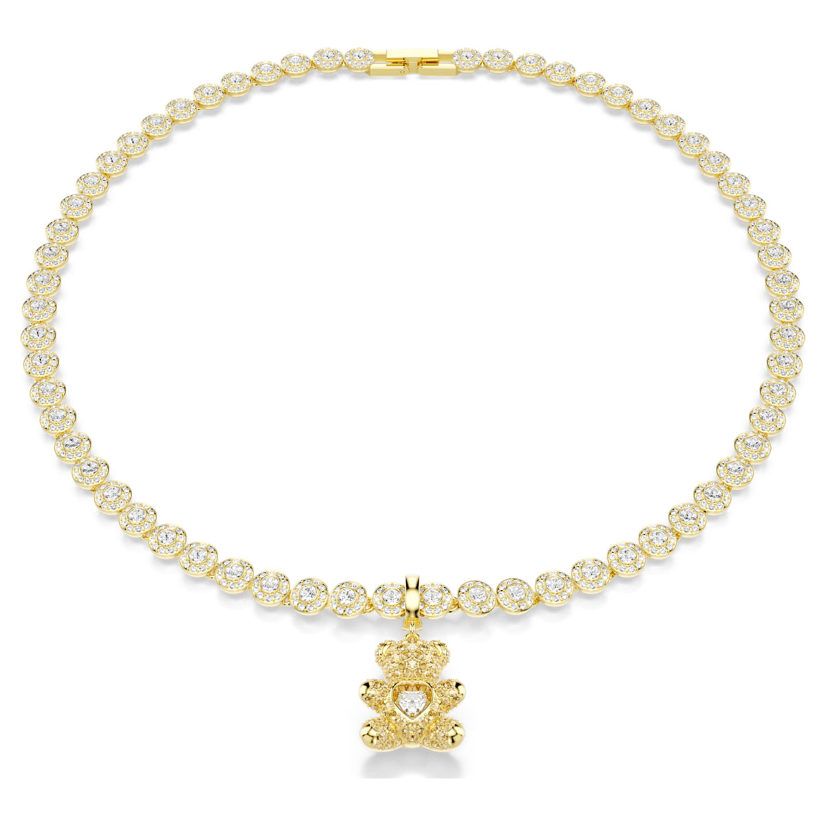 This Idyllia Charm by Swarovski is an ideal choice for those with a playful spirit who wish to add a personal touch to their jewelry. The gold-tone plated teddy bear charm is intricately decorated with shimmering crystals and features a radiant "dancing stone" at its center that moves with every gesture. This charming creation includes a custom-designed clasp, allowing you to easily attach it to various necklaces and bracelets. It symbolizes youthful joy and affection, making it a perfect gift for someone special or a whimsical treat to brighten your own daily style.