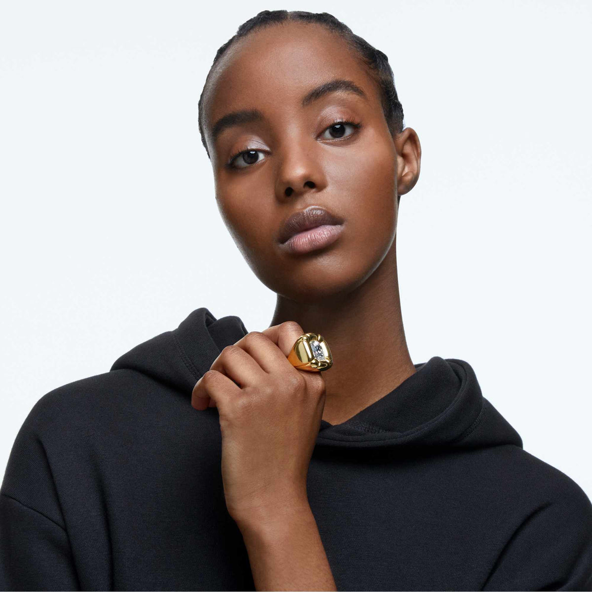 Inspired by sculpture from the Pop Art movement, this cocktail ring is playfully and unexpectedly soft in shape. A single precision cut clear crystal is cushioned in a glossy gold-tone plated molded setting, and finished with a tonal band and metal inlay. For a striking statement wear yours alone, or exercise your creativity and team it with other cocktail rings from the Dulcis family for a fun evening look. This ring is part of the Dulcis family, designed by Creative Director Giovanna Engelbert for Collection II.
