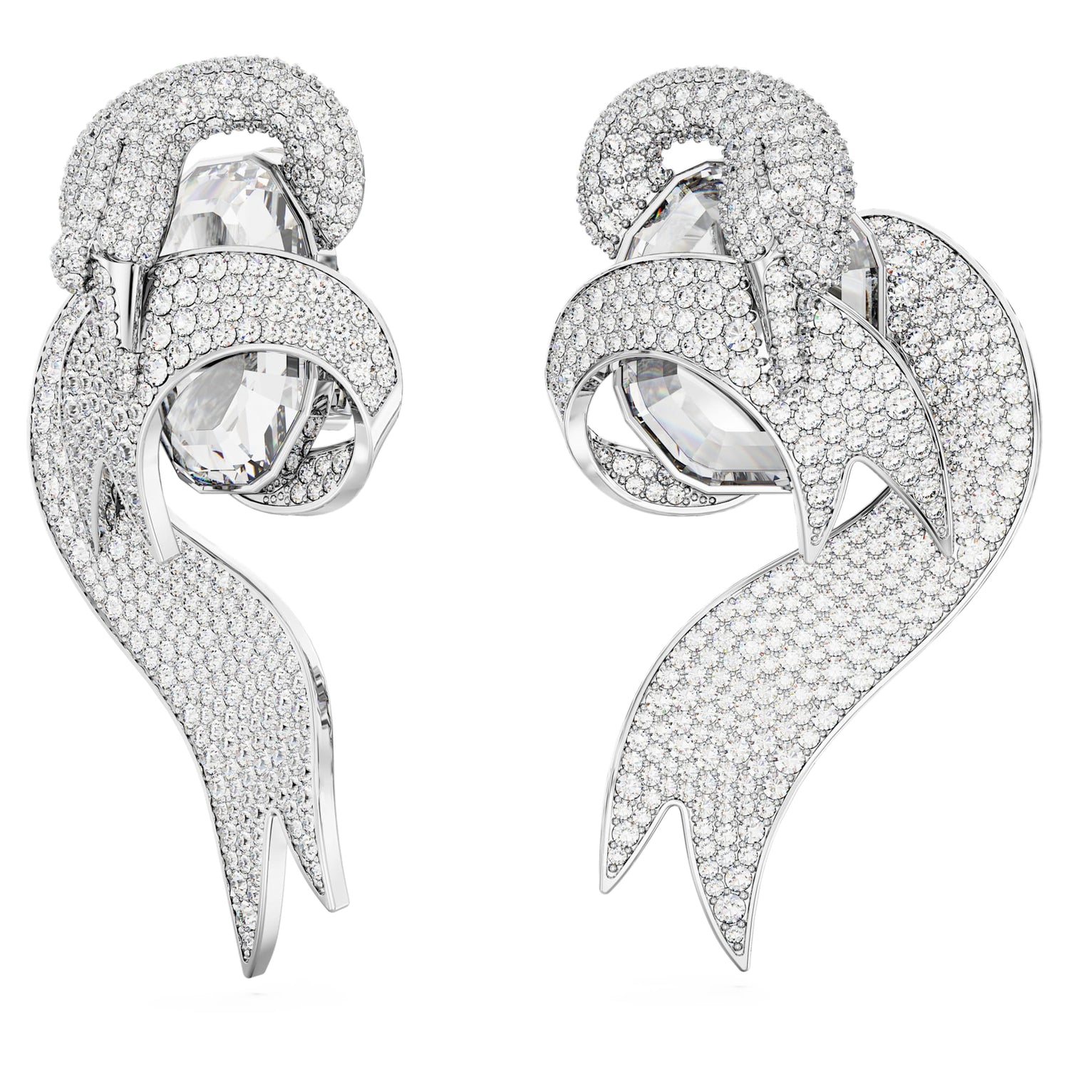 These unique clip earrings artfully capture the graceful movement of the Swarovski Swan. Each rhodium plated piece features a large octagonal stone at the center, surrounded by curlicued ribbons and a refined swan neck, all embellished with round crystals set using our patented Pointiage® technique. Wear these earrings for a special occasion to exude a true sense of luxury.