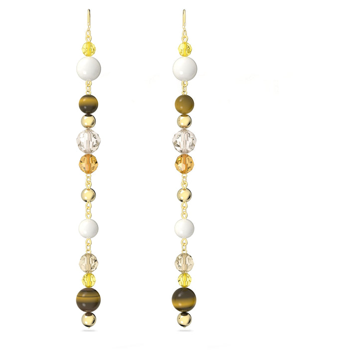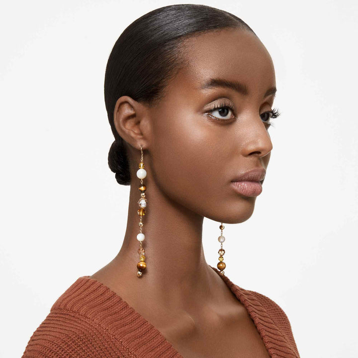 Bold and brilliantly modern, these delicate drop earrings are guarantee to make a statement, day or night. A contemporary take on bohemian beadwork, they feature lustrous tiger's eye beads and crystals set against a classic gold-tone plated setting. Wear them with hair tucked, perhaps layered with other styles from the Somnia family — anything goes.