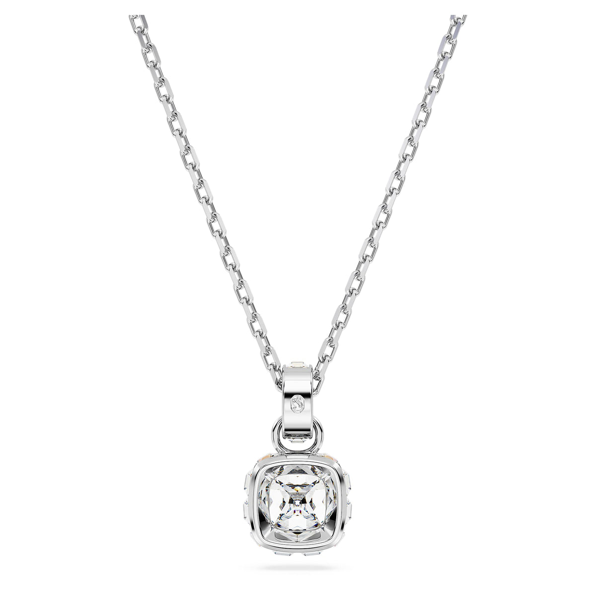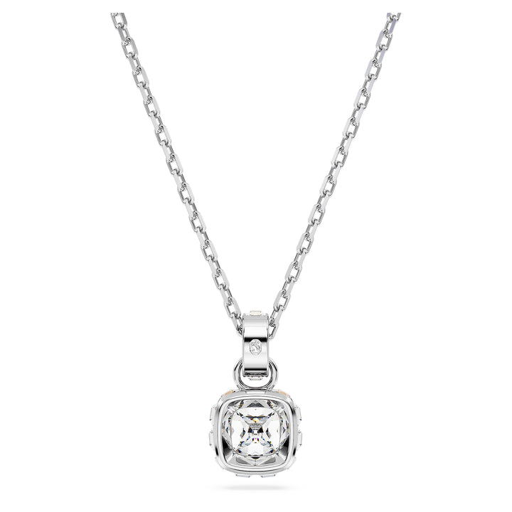 This delicate pendant is inspired by the birthstone of April. Hanging from a fine chain with a shimmering link of crystals, the rhodium plated jewelry features a single square-cut stone in a clear hue, representing strength, clarity, and the power within. This meaningful design makes a magical birthday gift or can be worn to celebrate a time that is significant to you.