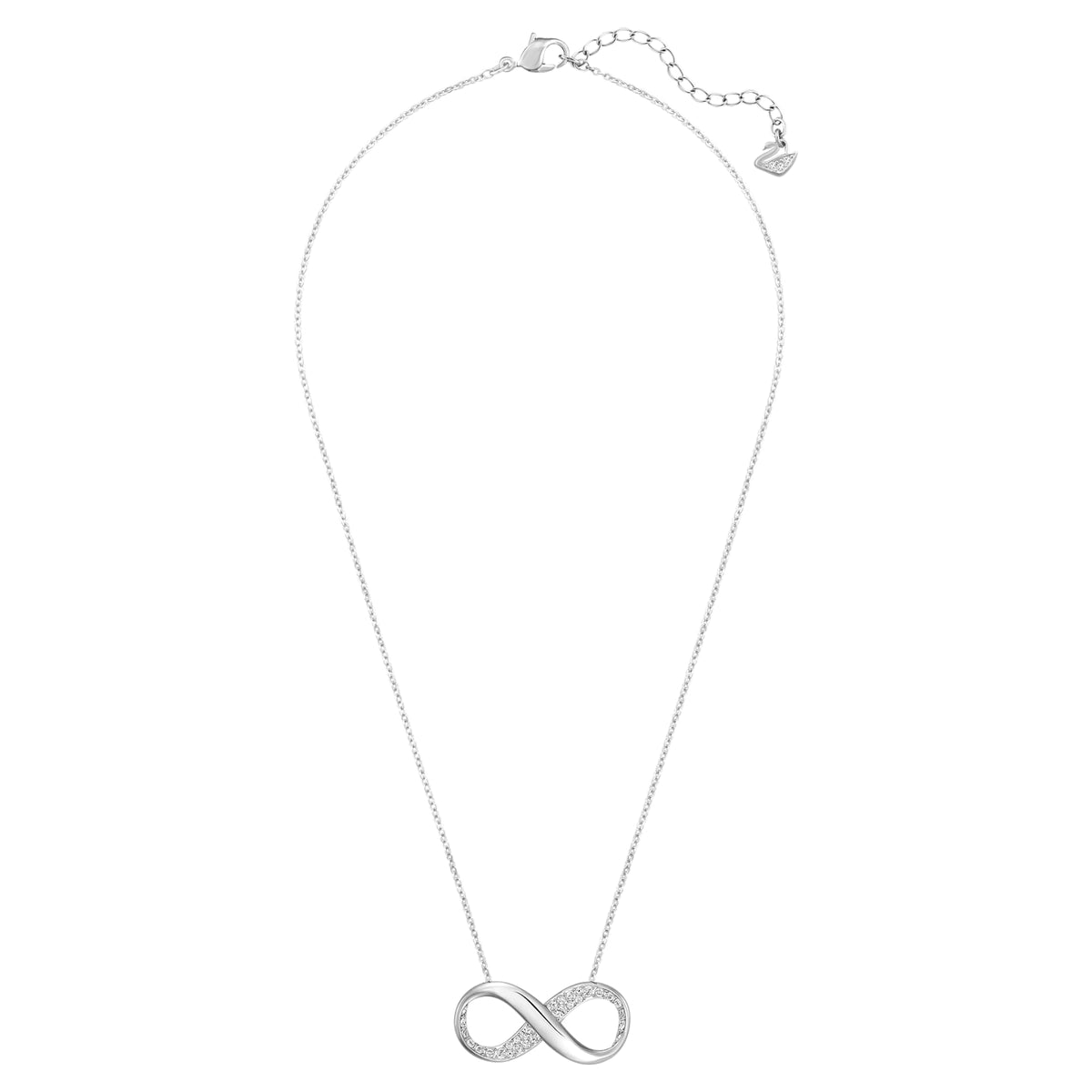 A touch of contemporary sparkle to brighten every day. The pendant’s unique ribbon design is knotted to form a beautiful infinity shape. Whilst one side of the intertwined loops shines in rhodium-plated metal, the other side gleams in clear crystal pavé. The pendant measures 3 x 1.5 cm and comes on a 40 cm chain. Matching items available.