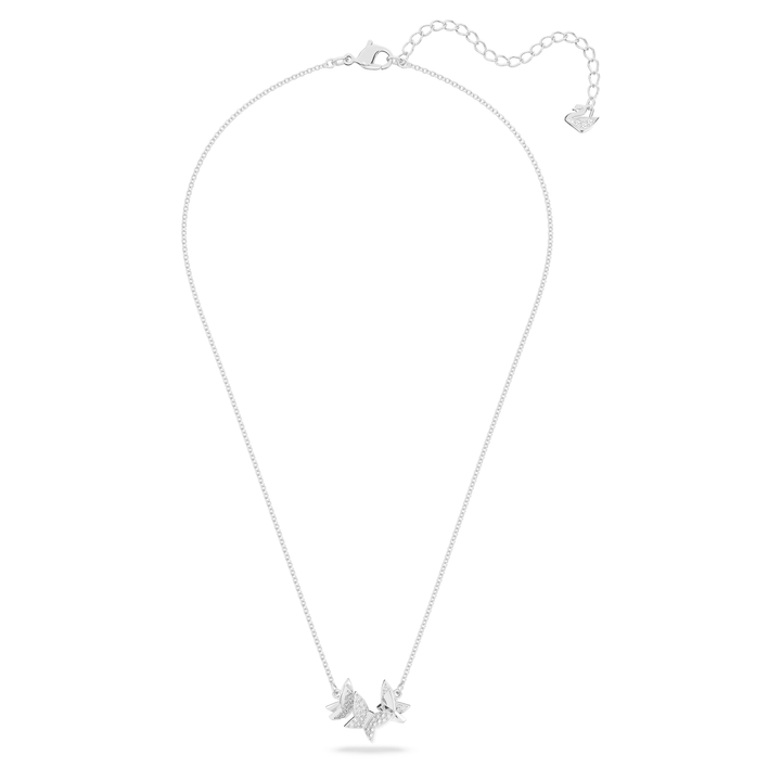 An elegant choice for everyday, this delicate necklace will become a new wardrobe staple. It features shimmering pavé butterfly motifs suspended from a sleek rhodium plated chain. The perfect partner to white T-shirts, cashmere jumpers, denim, or eveningwear – essentially, anything goes.