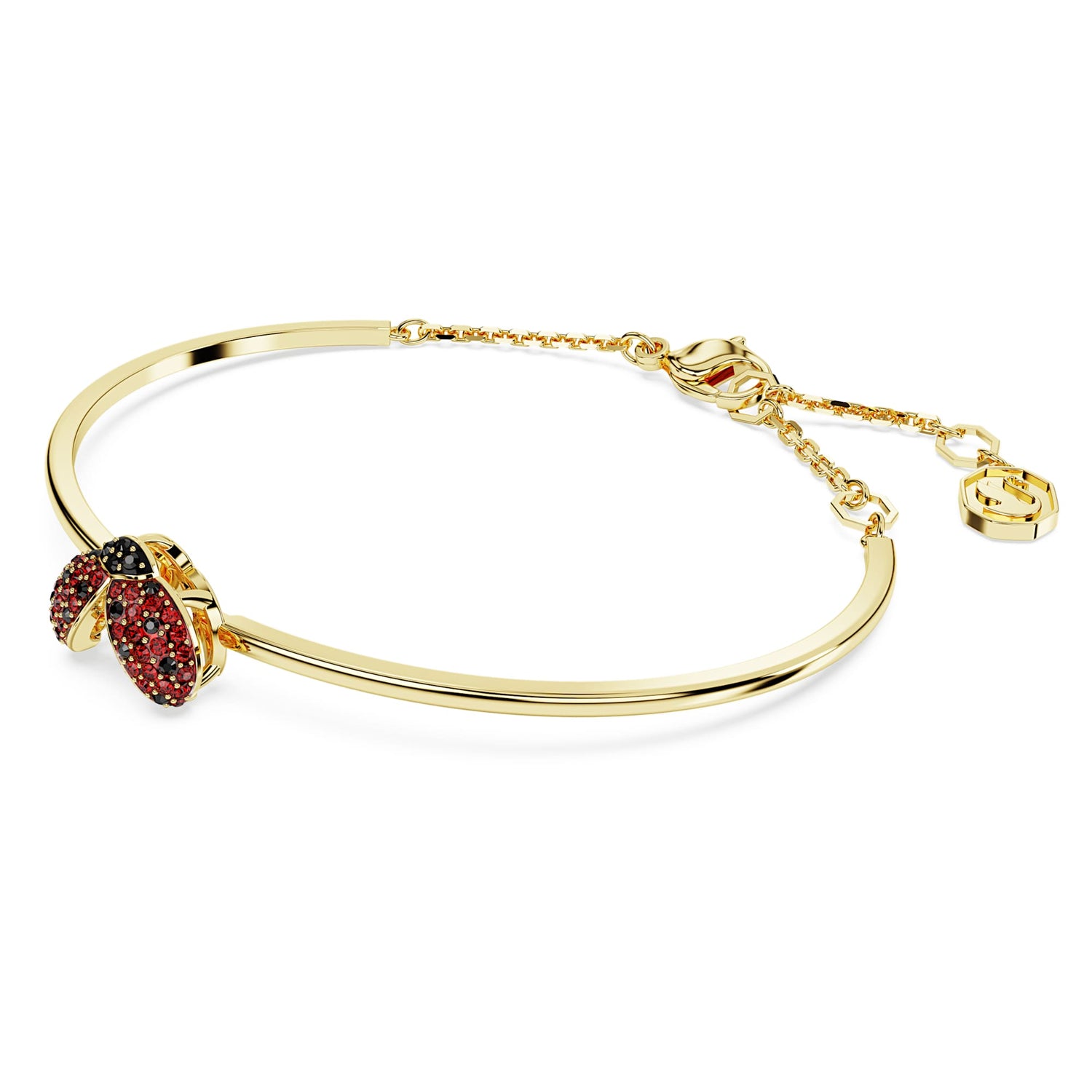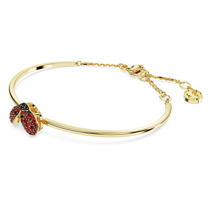 Add the magic of nature to your style with this wondrous ladybug bangle from the Idyllia family. The intricate design on gold-tone plating features a delightful ladybug at the center crafted with an all-over pavé of red and black crystals. Showcasing Swarovski's signature savoir-faire, its wings reveal a single pear-shaped dancing stone inside, bringing the piece to life with continuous motion. Wear this bangle to inject joy into your day.