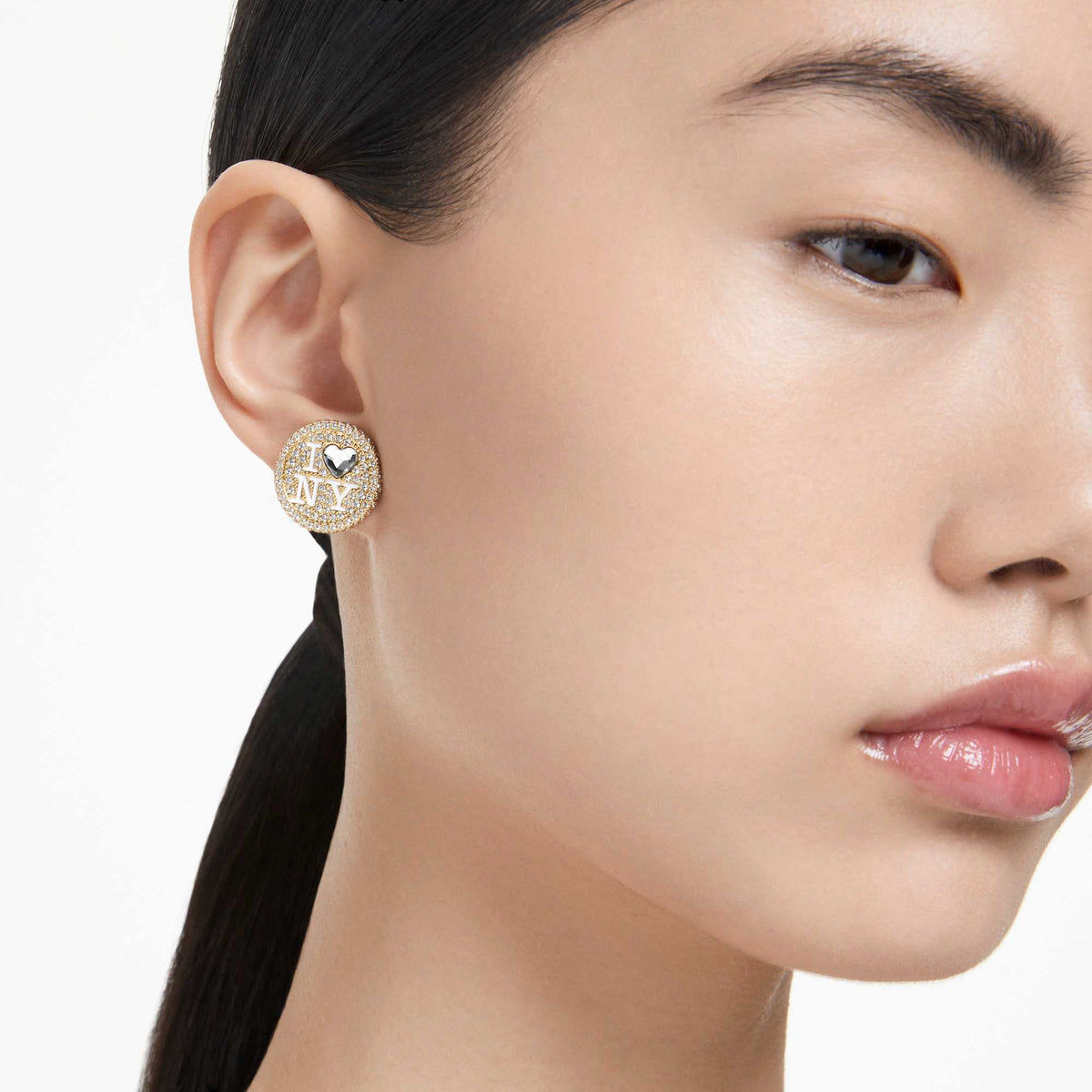 Get ready to shine. These reversible pierced earrings are perfectly matched to the vibrancy of New York City. Each gold-tone plated stud features an 'I LOVE NY' motif, with a heart-shaped stone and a full pavé of clear crystals. The beauty also continues on the reverse side, where the closures reveal an apple clutch in 3D, expertly crafted with a pavé of red pips. Exclusively available online in the USA and in select NY stores, these special earrings are a stylish celebration of a truly iconic destination.