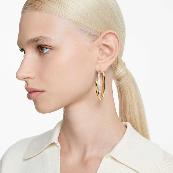 These radiant Dextera earrings take the classic hoop style to new levels of luxury. Crafted with a crossover design, each tubular piece delivers a beautiful contemporary style, featuring a gold-tone plated hoop that is half embellished with all-over clear pavé. Enhance the look by pairing these pierced earrings with a matching Dextera bracelet.