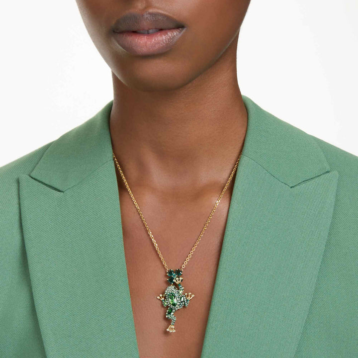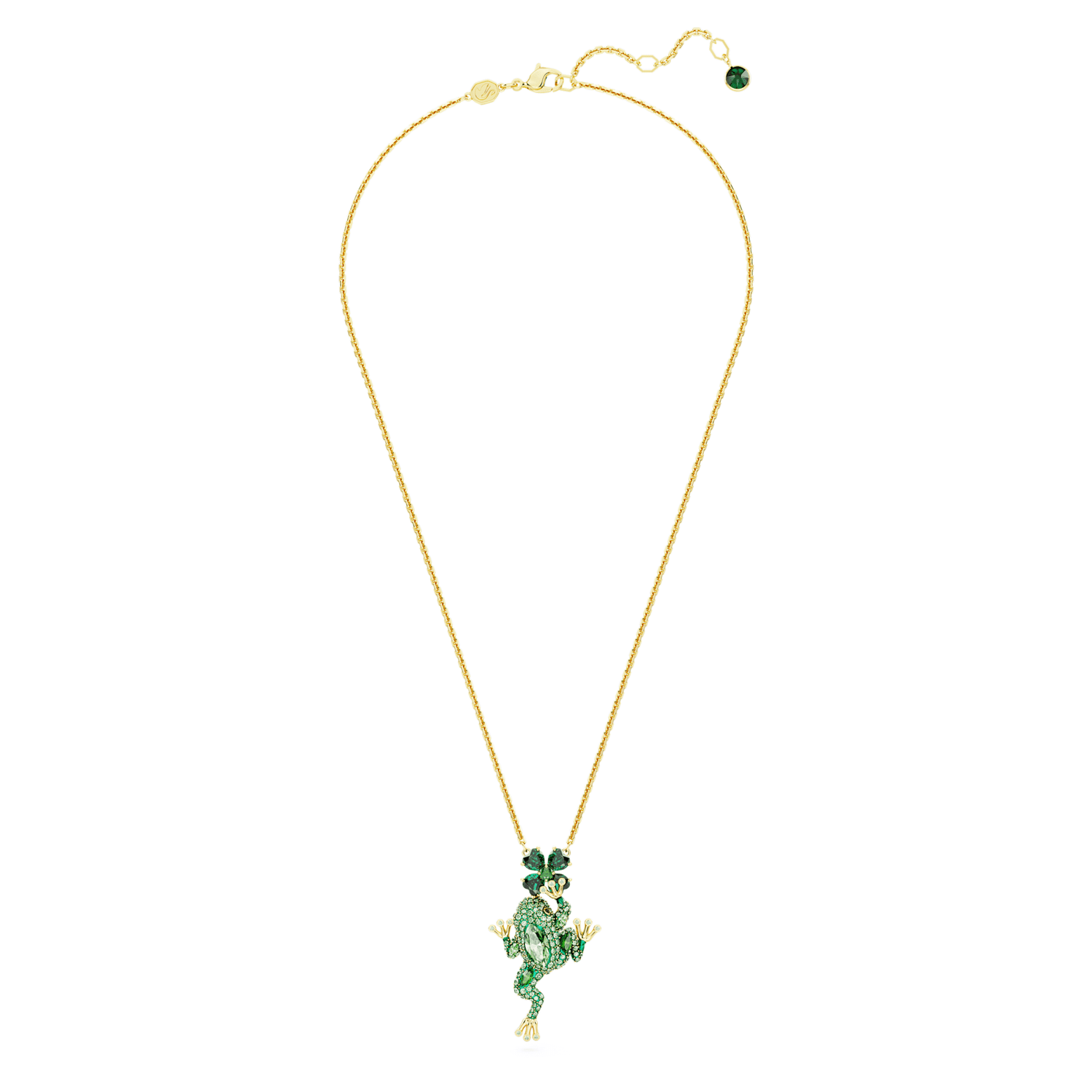 Be enamored by this exquisite frog pendant. The magic of Swarovski's savoir-faire is captured throughout this gold-tone plated design, which features a large navette-cut stone on the frog’s back surrounded by a variety of scintillating green stone cuts. The frog also holds a lucky four-leaf clover, made from four heart-shaped Swarovski Zirconia. A piece that will demand attention every time you wear it.
