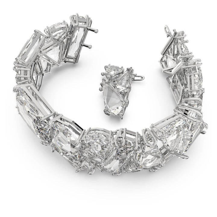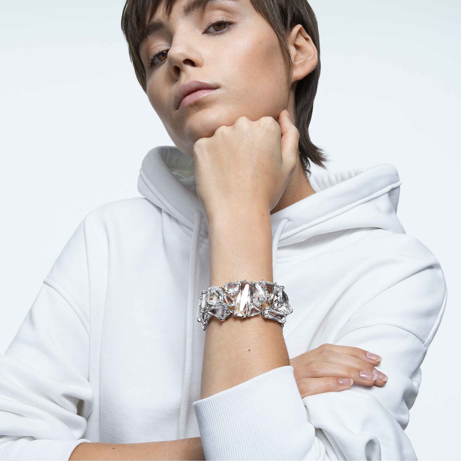 This striking bangle bracelet highlights the Mesmera family’s hypnotic qualities. Innovative crystal clusters are expertly arranged in a mosaic form, which cleverly conceals the rhodium plated prong setting. Wear it as a daytime statement with rolled-up shirt sleeves, or a simple shift dress for evening; both extravagant and timeless in equal measure. This bracelet is part of the Mesmera family, designed by Creative Director Giovanna Engelbert for Collection I. How to close and open it: place the rounded baton into the widest point of the opposite hole and slide it down to the lowest point. Once in place, lower the D-ring security catch on top to secure the fastening. To open, lift up the D-ring security catch and slide the baton towards the widest point to release.