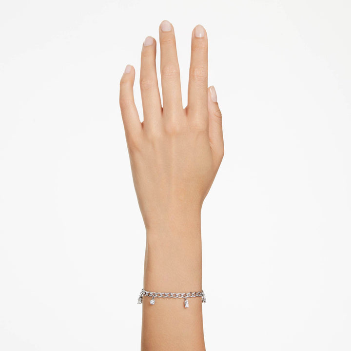 This Imber bracelet is adorned with a multitude of different crystals. The chunky chain is rhodium plated and features an array of radiant stones in various shapes and sizes. A single Swarovski Zirconia adorns the end of the elongation. Style with the matching necklace to exude pure confidence.