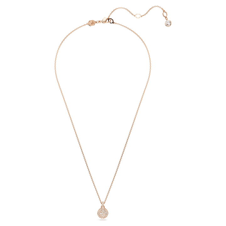 This galaxy-inspired pendant will bring dazzling impact to any style. The rose gold-tone plated design is worn on a delicate chain with a lobster closure and features a domed meteor motif that is beautifully adorned with a snow pavé of clear round crystals in different sizes. Wear it as a wondrous piece of light-catching joy.