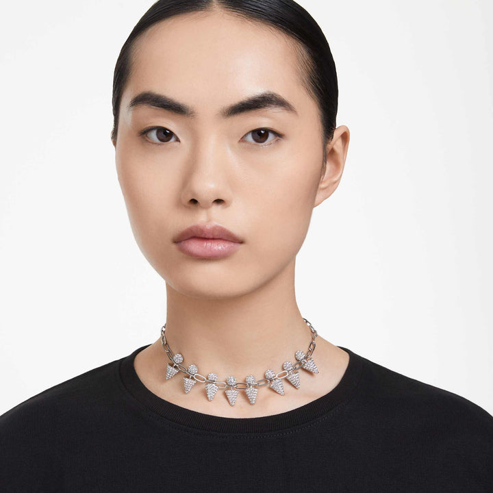 This edgy Sublima necklace takes moongazing inspiration in a bold new direction. The rhodium plated jewelry features a chain-link design with a full array of glistening spikes and balls, each adorned with a dazzling pavé of crystals. Wear this show-stopping necklace to express your own unique look, or pair with matching earrings from the same collection.