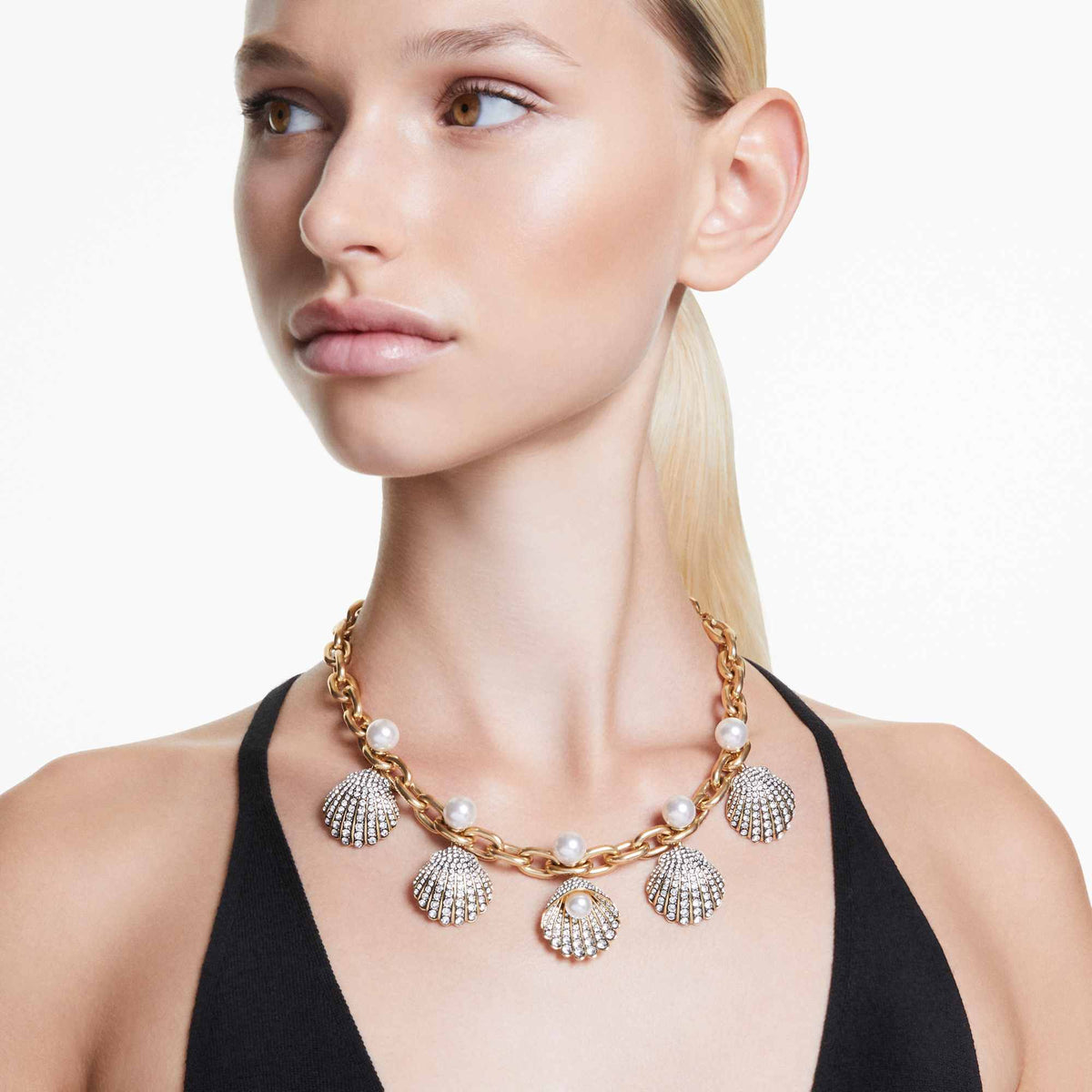 This stunning Idyllia necklace is the perfect way to add depth to your wardrobe. The gold-tone plated jewelry features a linked chain with five white Crystal Pearls and five shell motifs, each artistically adorned with clear round crystals. An ocean-inspired piece that shines like the surface of the water.