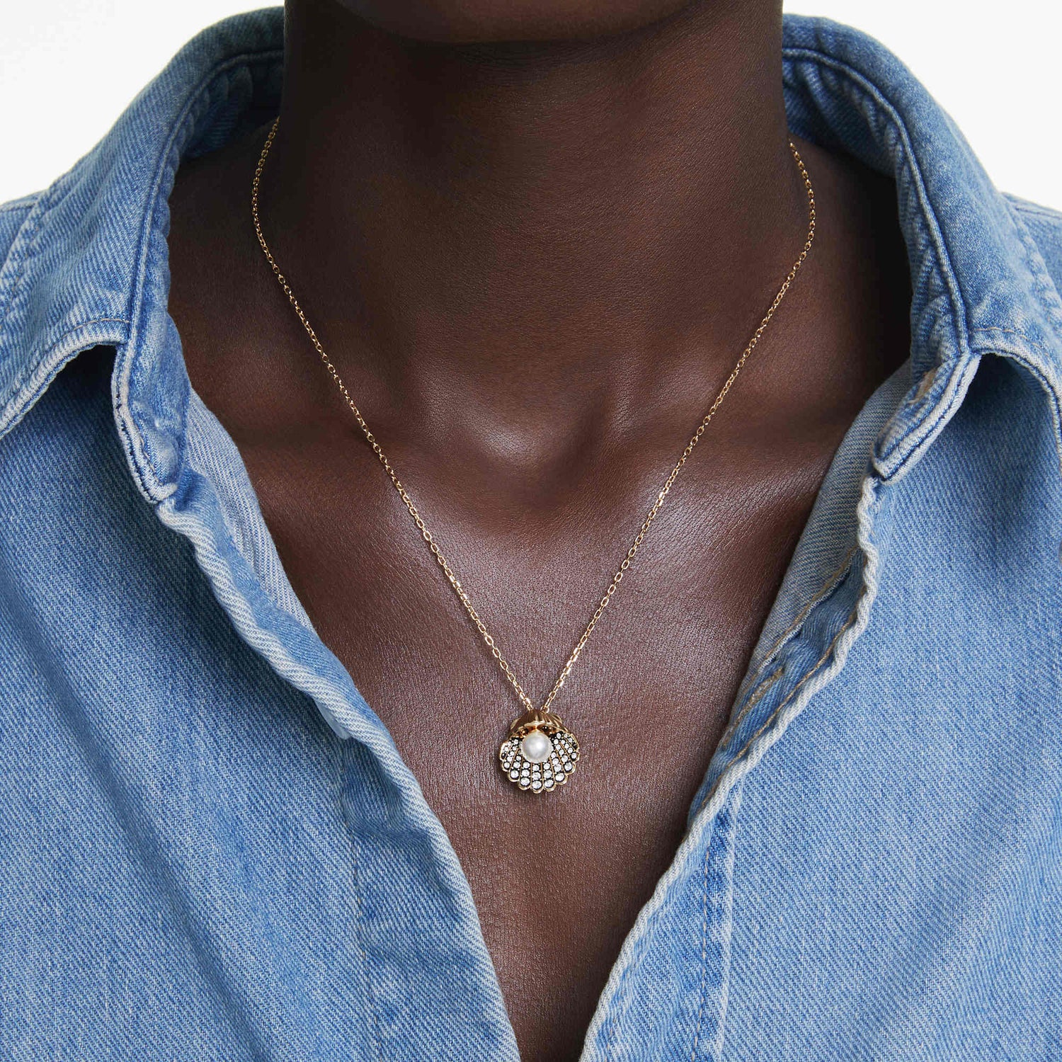 Capturing the serenity and beauty of the ocean, this Idyllia pendant will bring a touch of marine inspiration to your style. The gold-tone plated piece is worn on a delicate necklace and features a shell motif at the center. This has been artistically adorned with clear round crystals placed within a black setting, while a single Crystal Pearl sits inside. For extra versatility, the pearl can be pulled out of the shell, adjusting the style into a Y-shape design. A simple and captivating way to feel at one with the sea.
