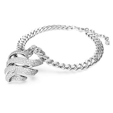 With its audacious flowing expression of a heart design, this large Hyperbola choker makes a bold style statement. Worn on a linked chain, the ribbon-inspired pendant is rhodium plated with a twirling pavé of bright clear crystals. This standout piece will surely capture your own heart, or the heart of a loved one you choose to gift it to.