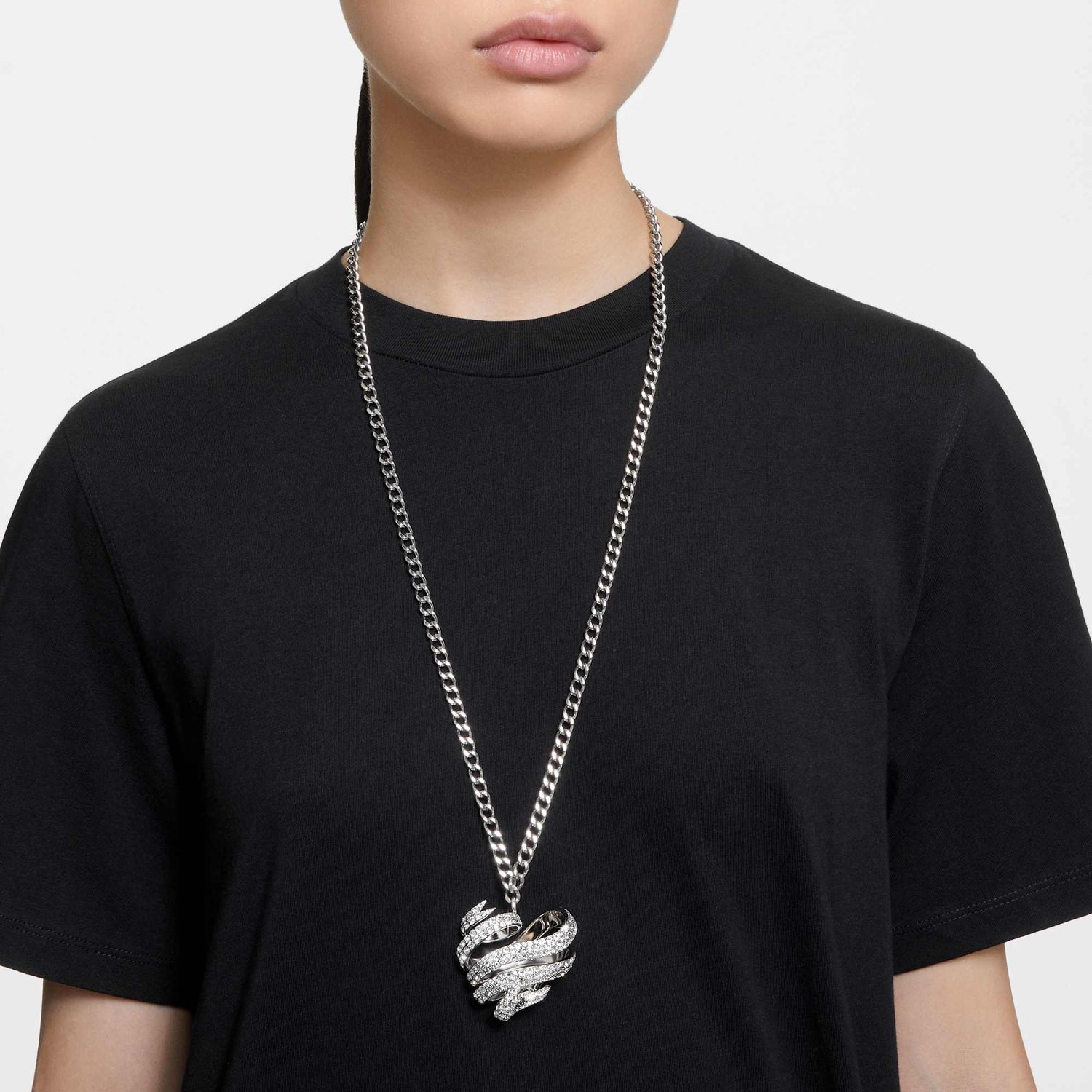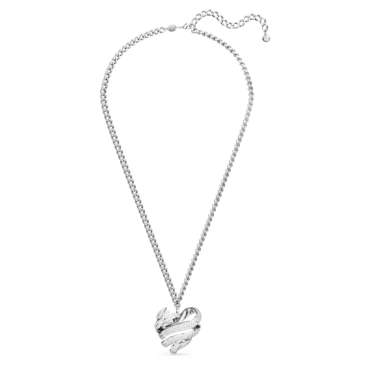 With its large flowing expression of a heart design, this astonishing Hyperbola pendant is an artwork all of its own. Worn on a chain, the ribbon-inspired pendant is rhodium plated, with a twirling pavé of bright clear crystals. Let your own heart be carried away by this beautiful jewelry creation and wear it as the centerpiece of your style. A perfect gift choice for a romantic occasion.