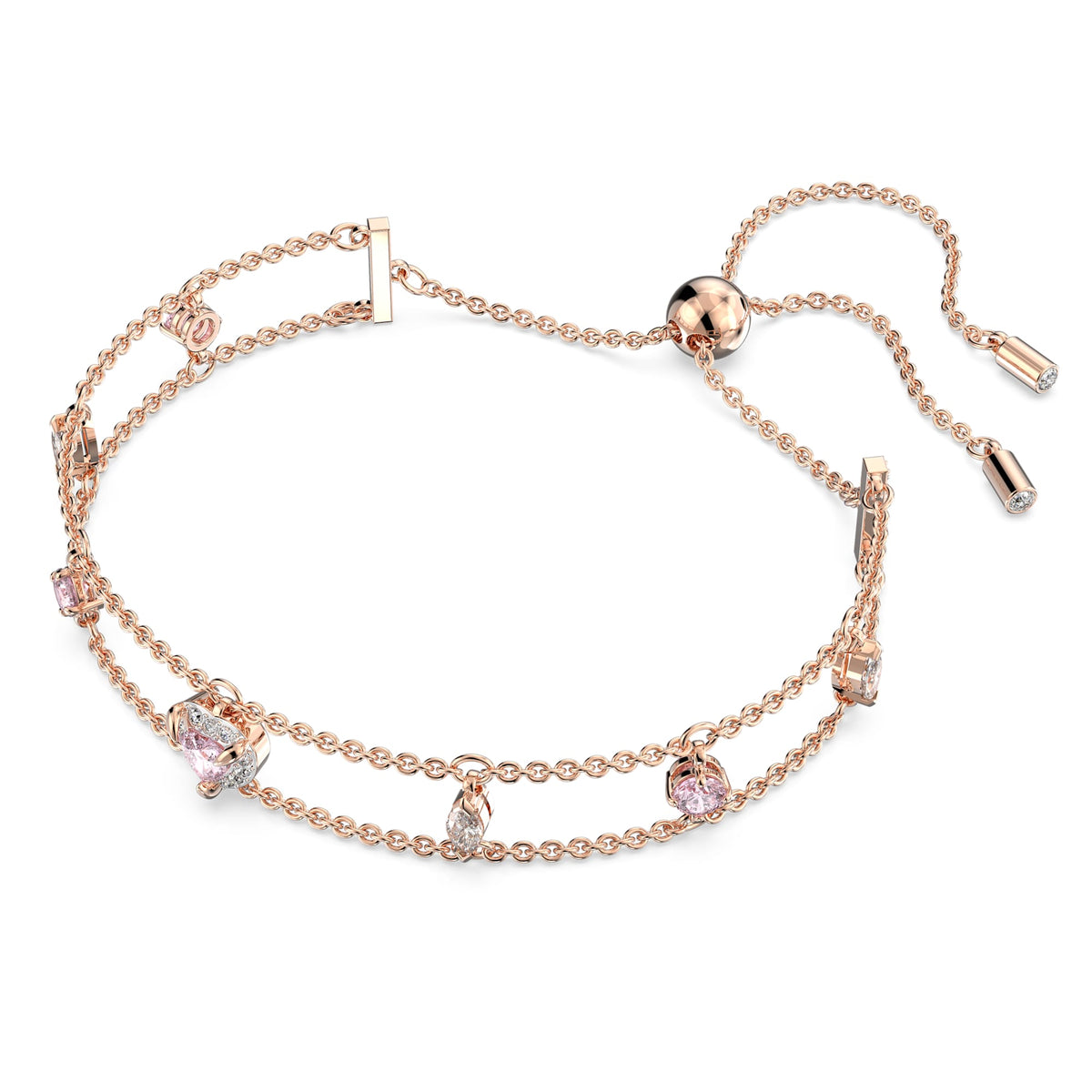 Attract romance with this contemporary bracelet from the One family. Designed with a dual chain silhouette, this playful piece features a mix of full-cut crystals complete with a pink heart-shaped centerpiece. It's finished with rose gold-tone plating and an adjustable sliding closure. The perfect gift for a loved one – or yourself.