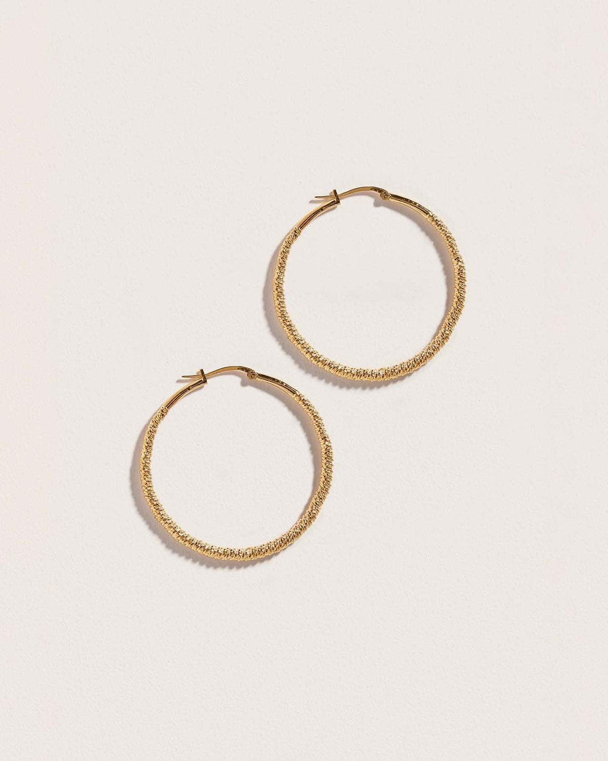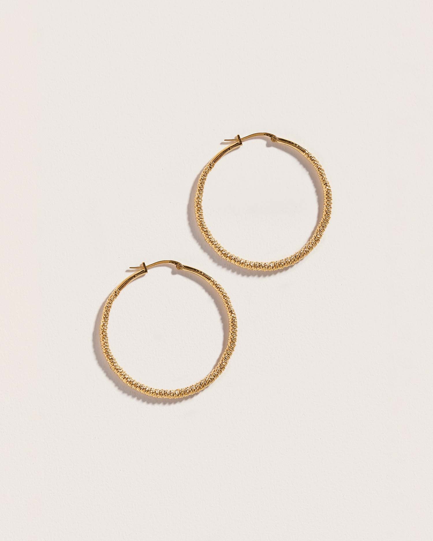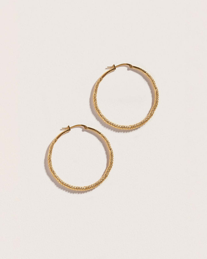 These hoops by Pamela Love feature intricate hand-carved coils, offering a modern twist on a classic silhouette. The oversized design adds a bold yet refined statement to any outfit, making them perfect for both casual and formal settings.