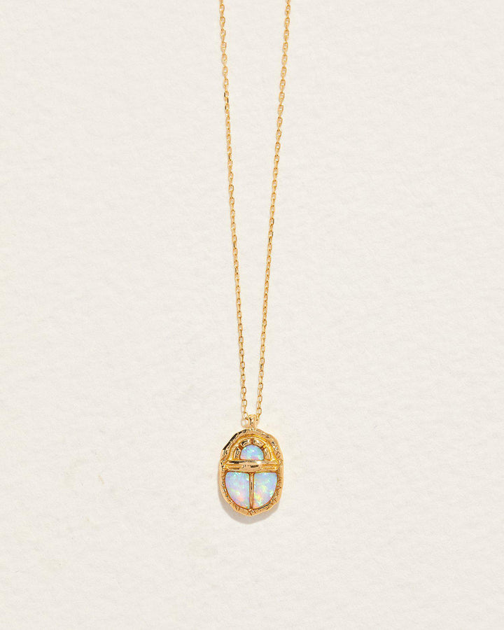 The Inlay Scarab Pendant by Pamela Love is a masterful creation featuring a hand-carved scarab beetle with organic textures crafted in recycled 14k yellow gold. The scarab, with its fiery opal inlay, symbolizes existence, manifestation, and growth, as interpreted from ancient Egyptian beliefs. A scarab hieroglyph is delicately carved on the reverse side, enhancing its symbolic significance.