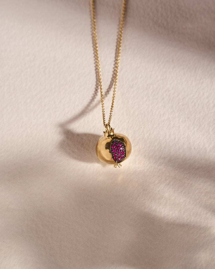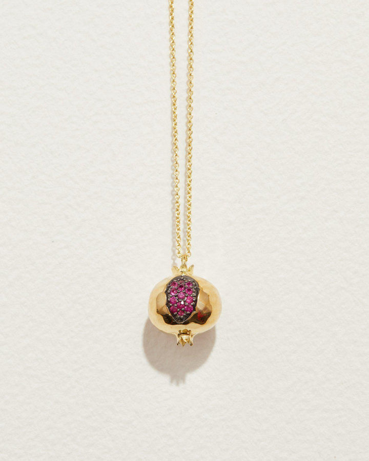 The Ruby Hera Pendant by Pamela Love showcases a sculptural hand-carved pomegranate charm in 18k yellow gold, with deep red ruby seeds. Suspended on a delicate cable chain, this elegant necklace is a tribute to natural beauty and craftsmanship. Available exclusively at pamelalove.com.