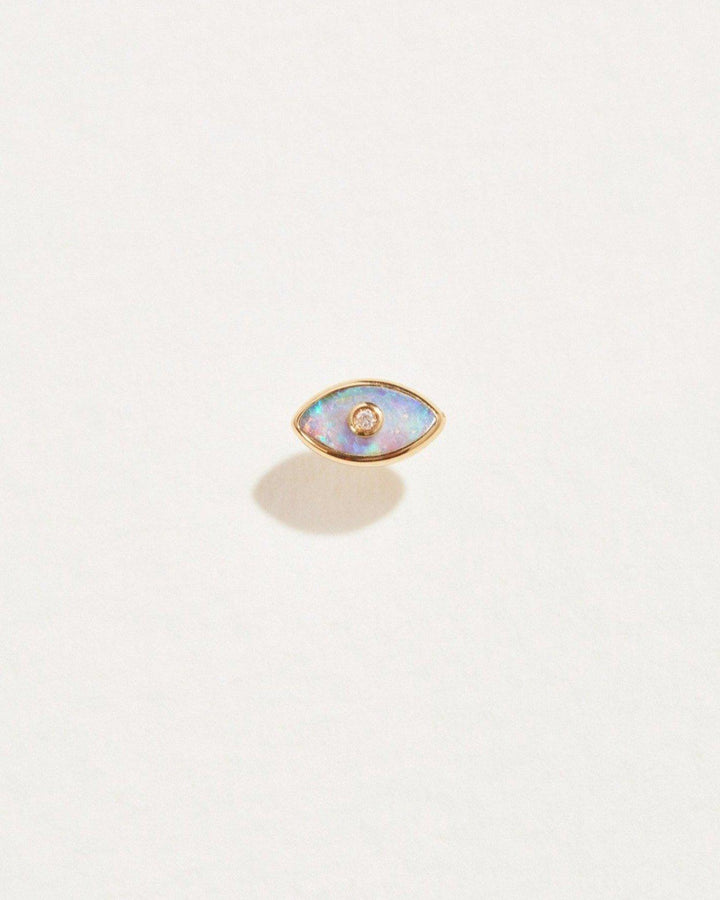 The Eye Diamond Stud by Pamela Love features a sleek eye-shaped design with a dreamy opal inlay and a sparkling white diamond at the center. This understated yet elegant piece is perfect for helix, lobe, tragus, and flat piercings. Wear it solo or as part of a pair. Sold as a single.