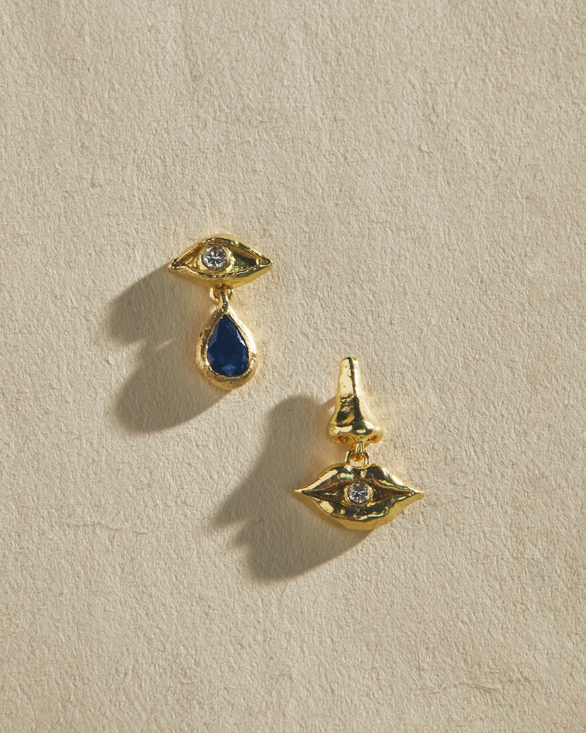 The Voice Earring by Pamela Love is a surrealist masterpiece featuring parted lips holding a diamond secret, accented by sapphire and aquamarine. Inspired by the surrealist icons Claud Cahun and Leonor Fini, this single earring invites creative expression. Handmade in Los Angeles.