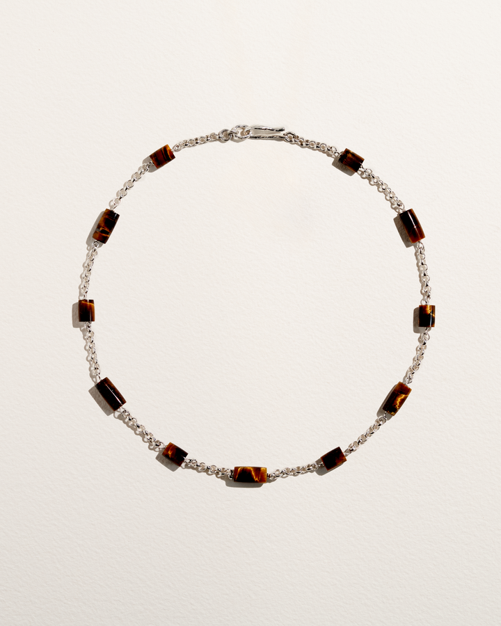 The Astrid Necklace by Pamela Love combines fragmented tiger's eye beads with a sterling silver chain, sitting gracefully below the collar. Striking when worn solo and stunning when layered.