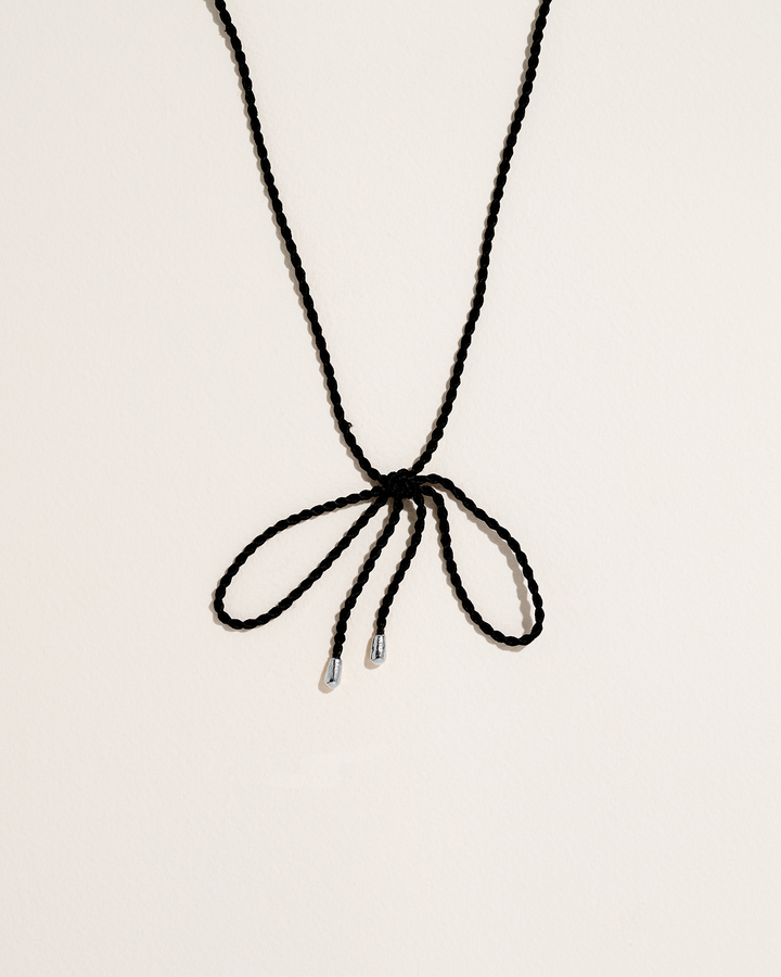 The Silk Cord by Pamela Love is crafted with twisted Japanese silk from Mokuba, featuring sterling silver end caps. This adjustable piece can be styled as a choker or long necklace for a sleek, versatile look.