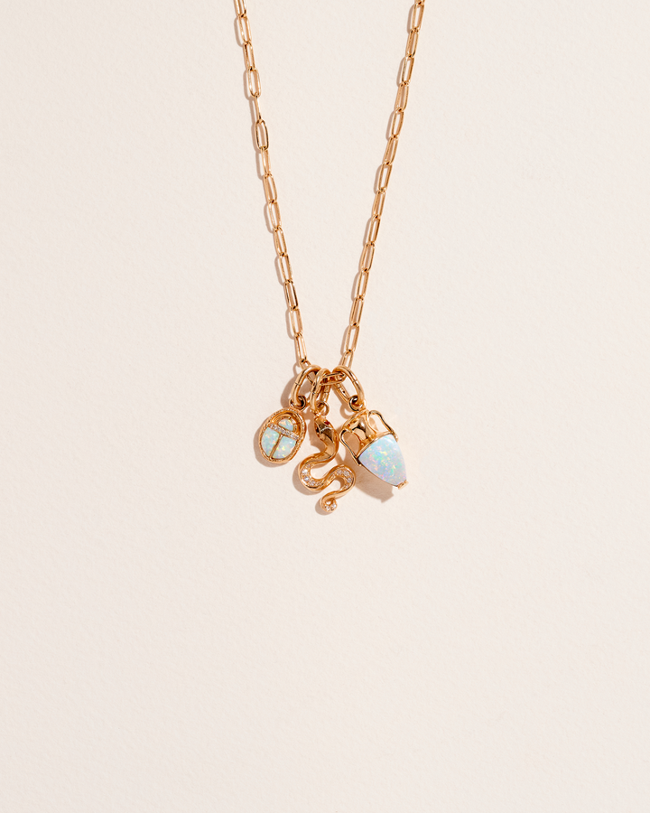 The Inlay Vessel Charm by Pamela Love is a delicately detailed hand-carved vessel charm that embodies personal transformation and spiritual symbolism. Featuring a luminous Gilson opal inlay, this charm represents the inner space where transformative processes occur. Inspired by the spiritual significance of vessels across traditions, it symbolizes the soul's journey through the cycle of birth, death, and rebirth. Ideal for layering or stacking with Pamela Love chains, bracelets, or earrings, this piece offers endless styling possibilities.