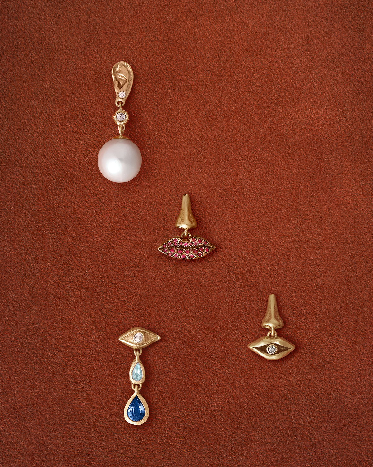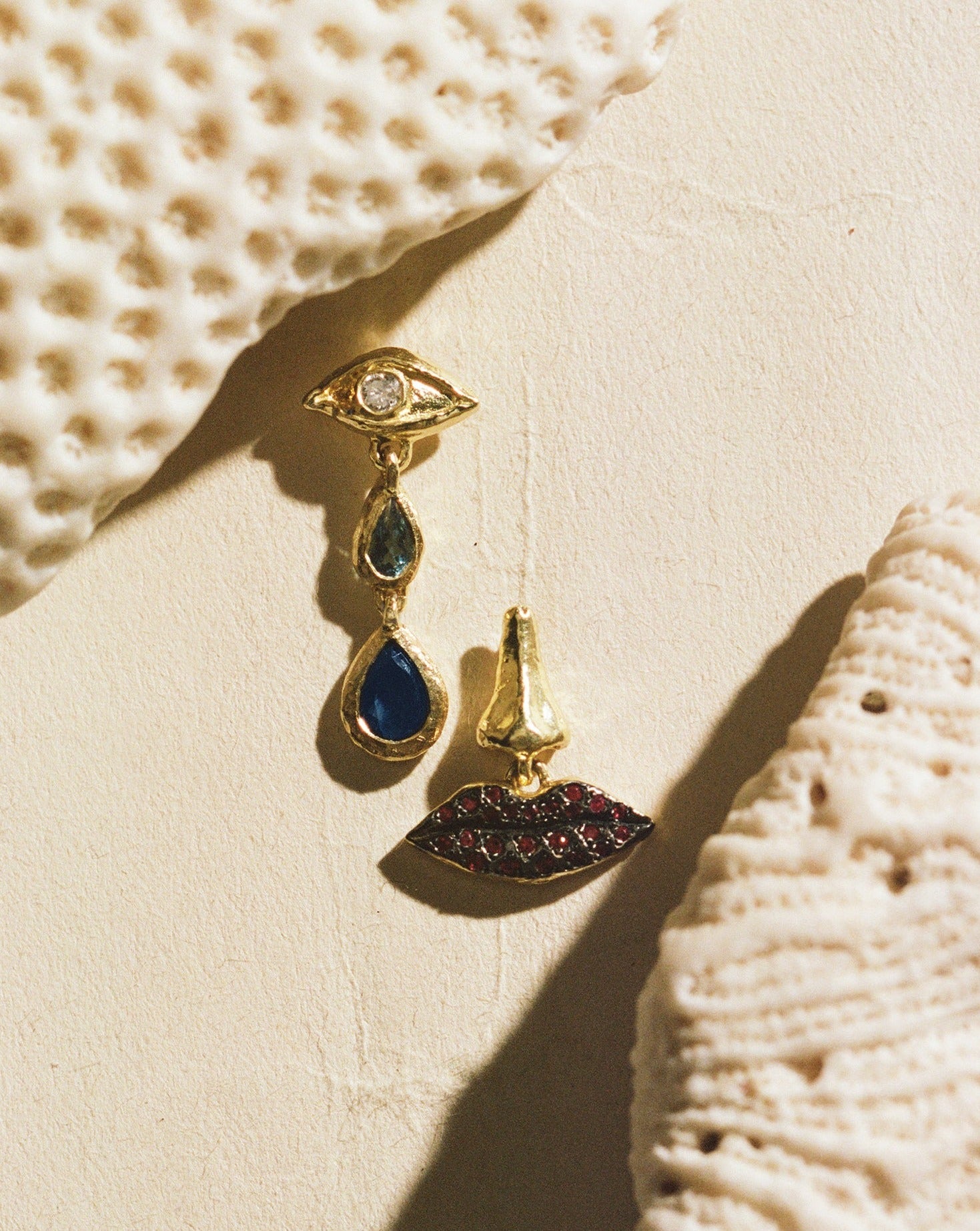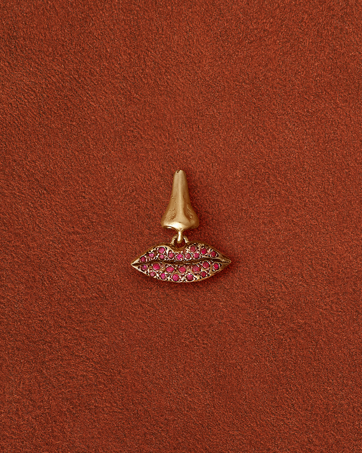 This Claude Earring by Pamela Love reimagines surrealist elements into an eye-catching composition. Ruby-studded lips part slightly in a sly smile, hanging from a sculptural nose motif, creating a whimsical yet bold artistic statement. A perfect fusion of fine craftsmanship and surrealist inspiration, this single earring encourages playful styling.