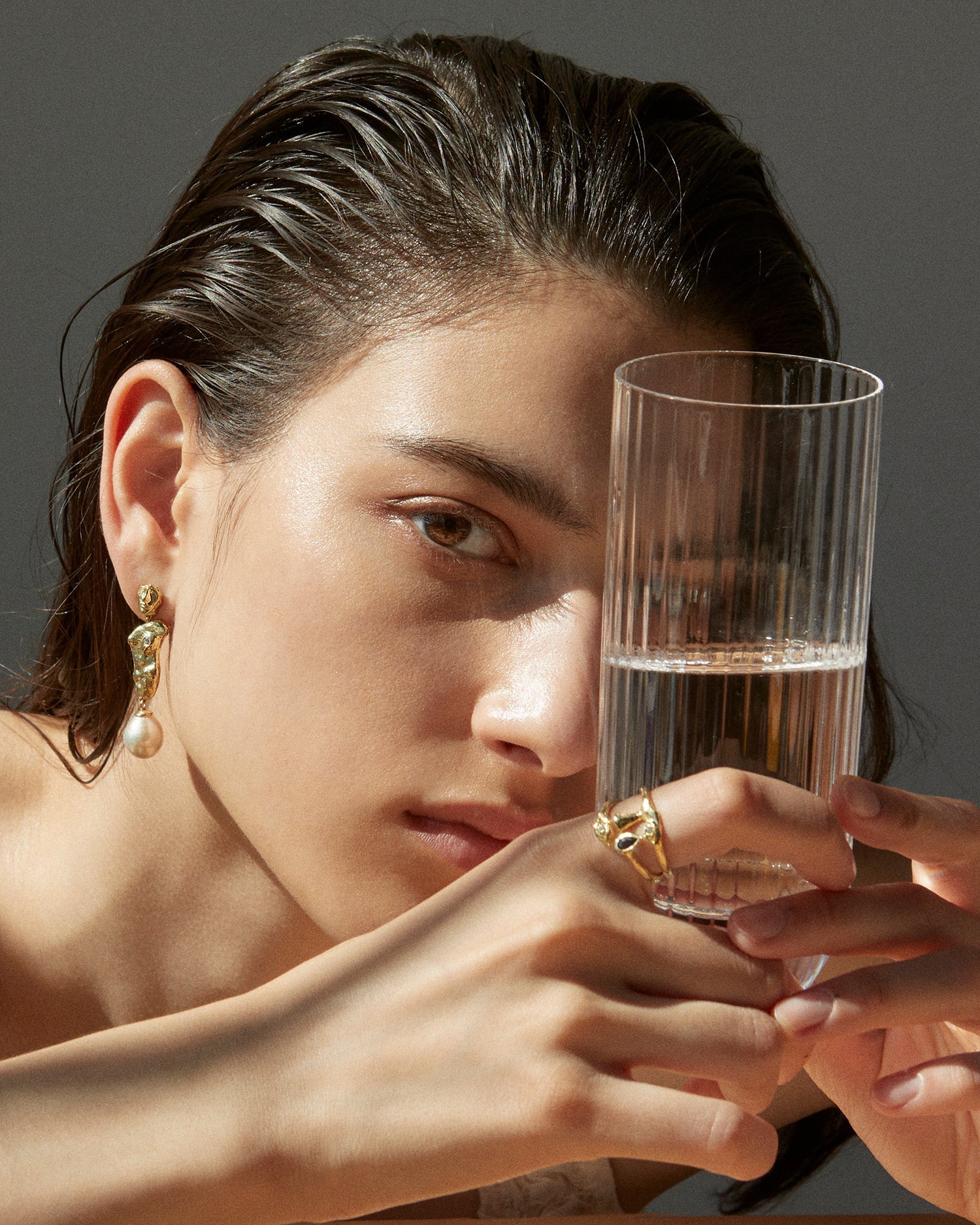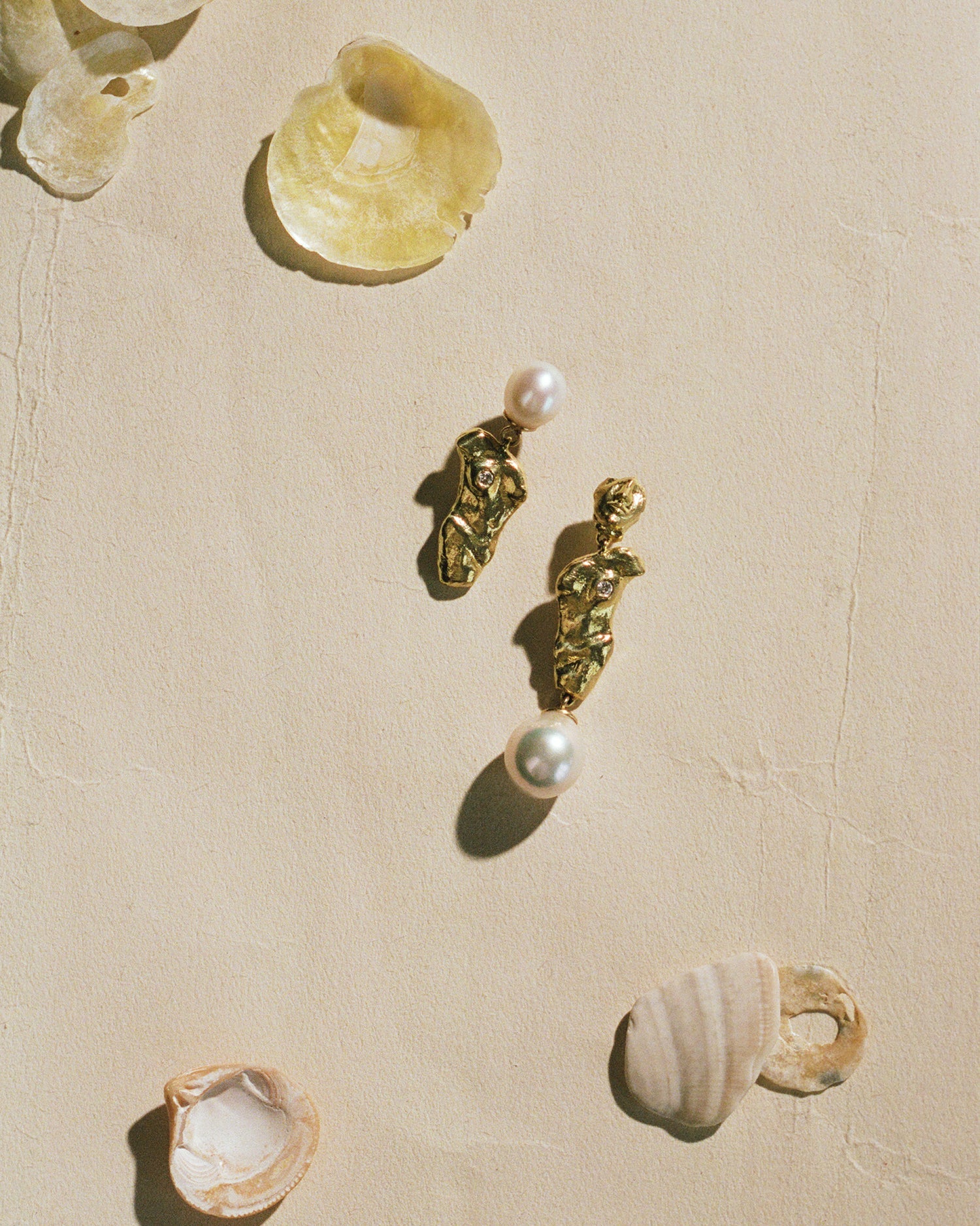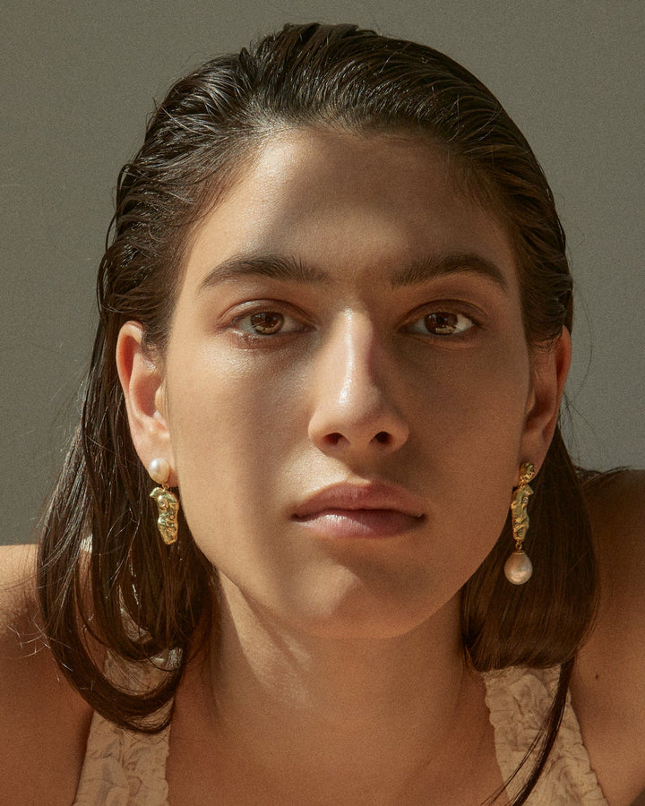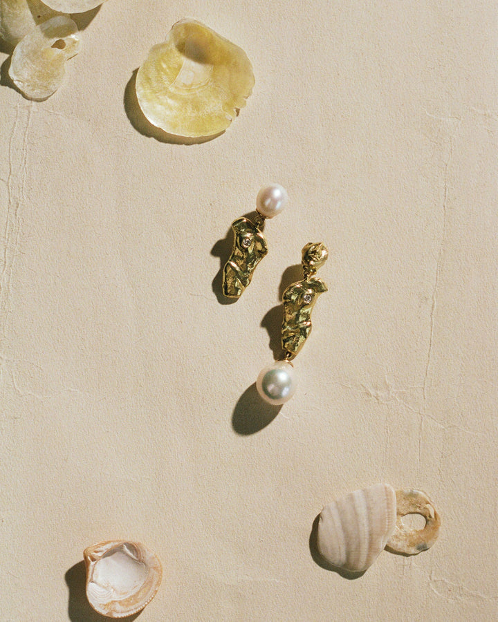 These Fragment Earrings by Pamela Love explore asymmetry and sculptural beauty. Mirrored torso drop earrings hang from unique, mismatched posts—one adorned with an oversized baroque pearl, the other with a fragmented visage—blending historical influences with contemporary design.