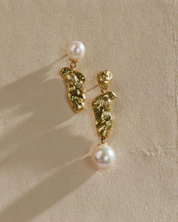 Handcrafted in recycled 18k yellow gold with white diamonds and baroque pearls. Left earring length: 24mm; Right earring length: 35.5mm.