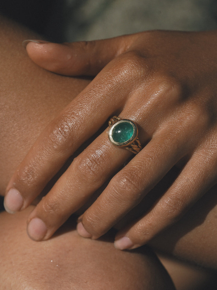 This Calliope Ring by Pamela Love is a stunning tribute to the weaving of souls. An ethereal, handpicked Muzo emerald is nestled in an intricately braided 18k gold band with a molten bezel setting, emphasizing organic imperfection. A one-of-a-kind piece, it is ideal as a ceremonial ring or a treasured heirloom.