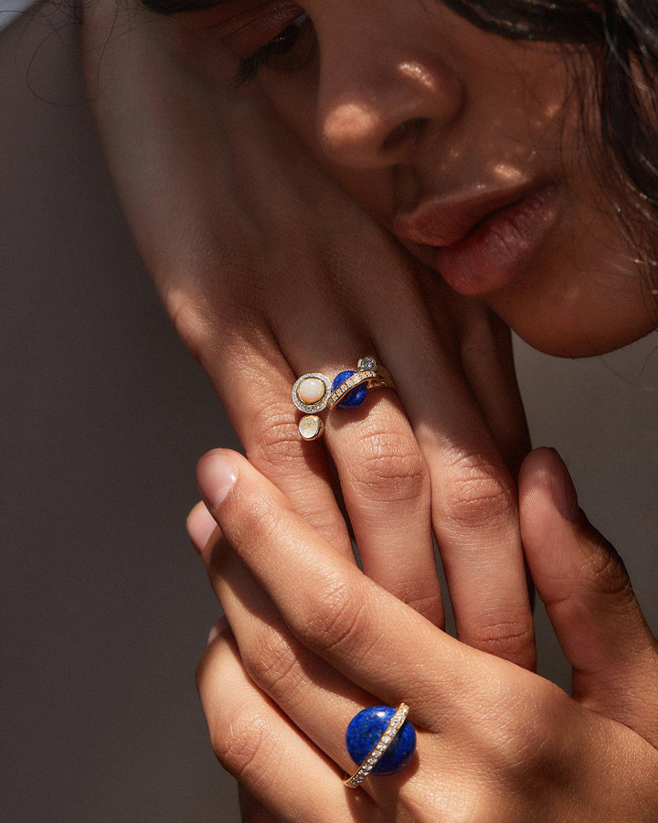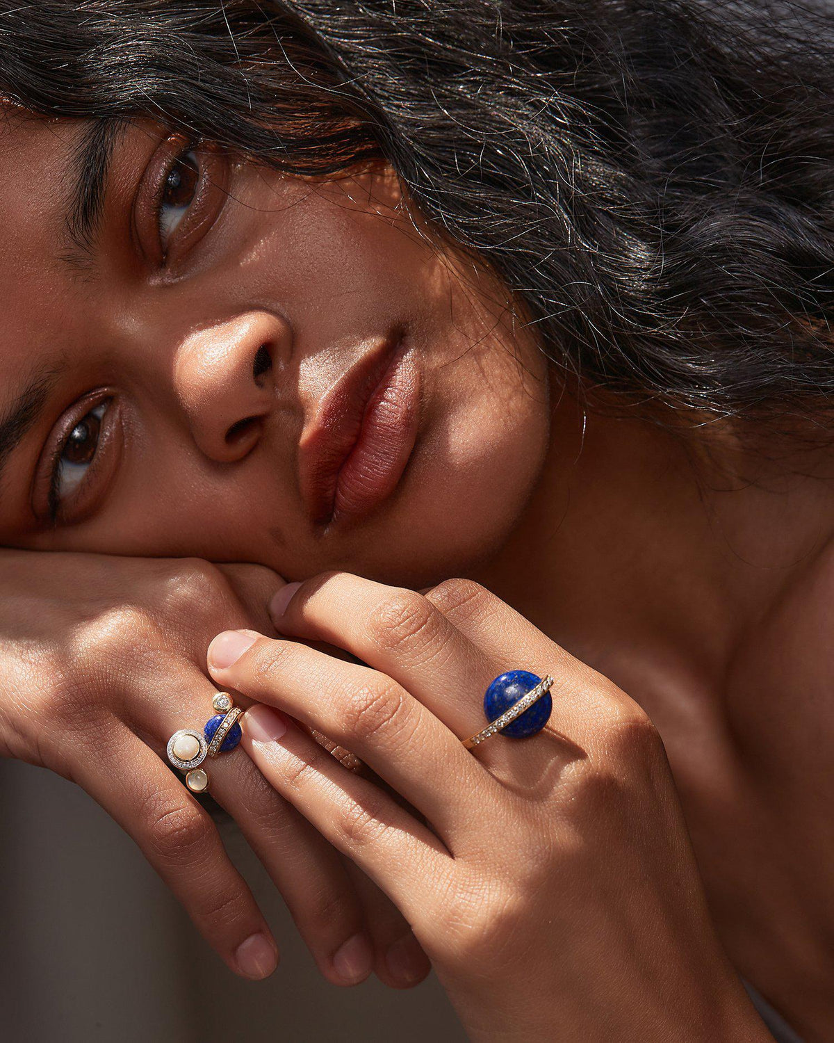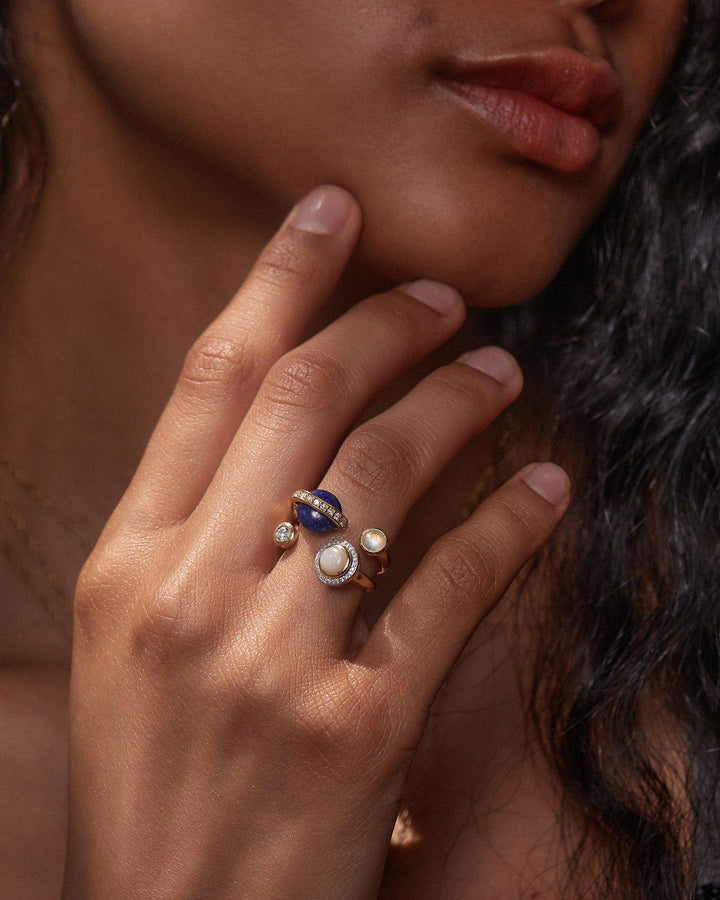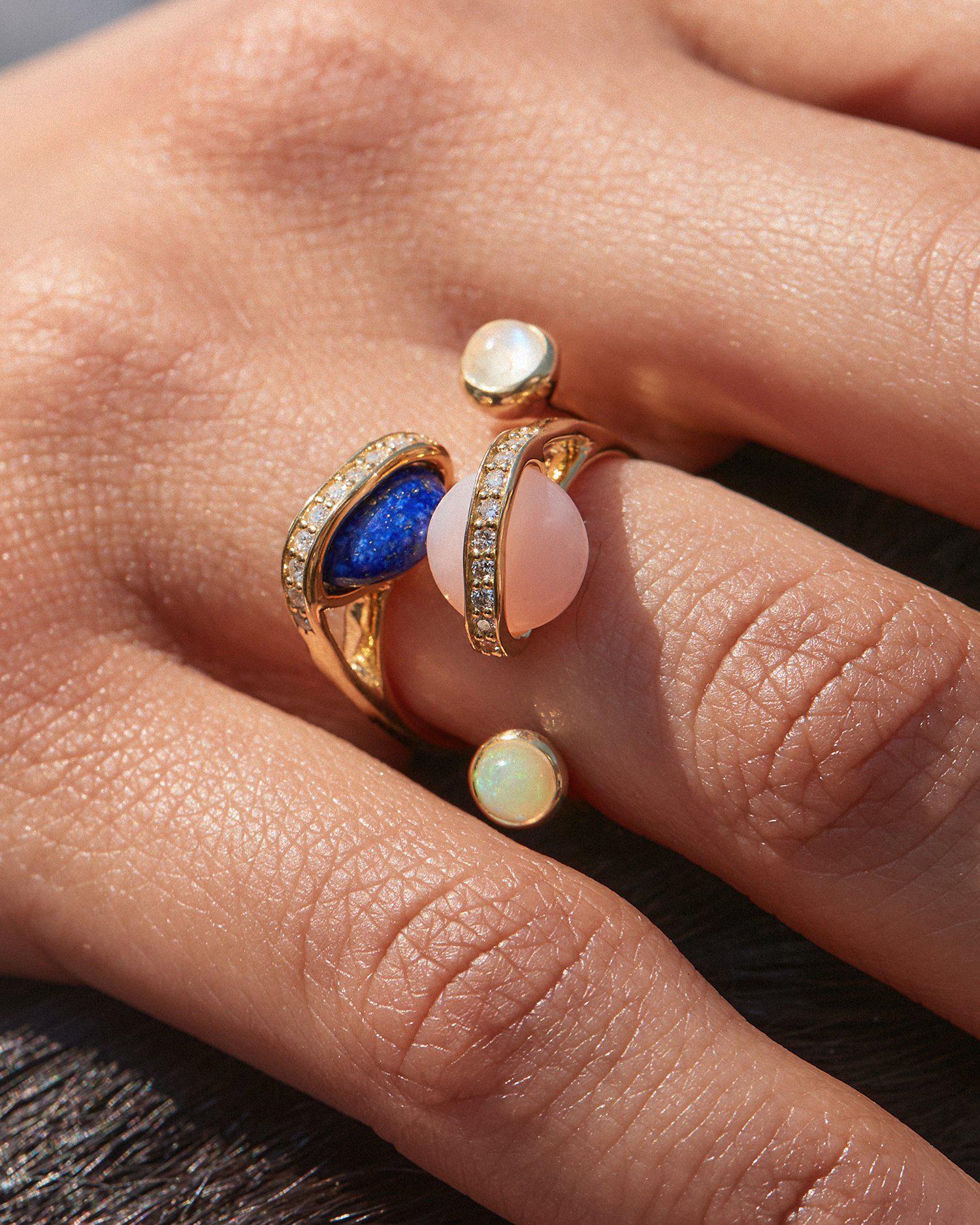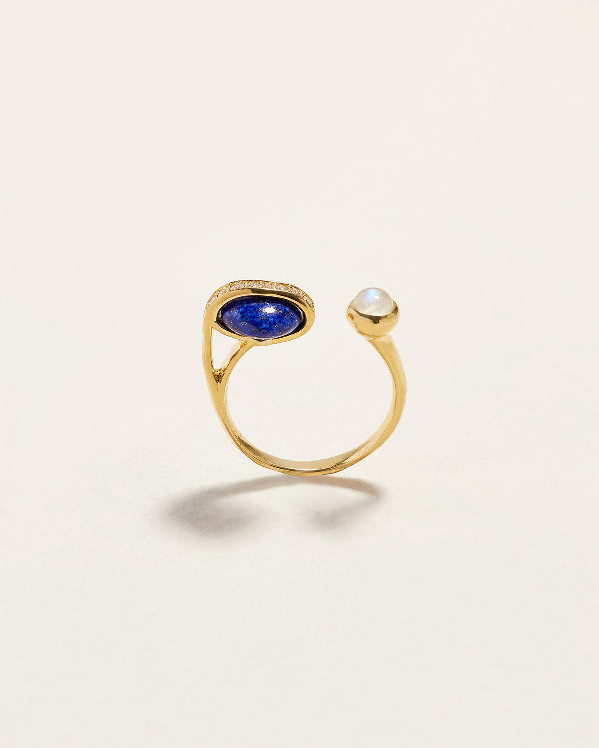 This Comet Gravitation Ring by Pamela Love embodies balance and cosmic beauty. An open 18k gold band features a lapis stone wrapped in pavé diamonds, counterbalanced by a glowing moonstone.