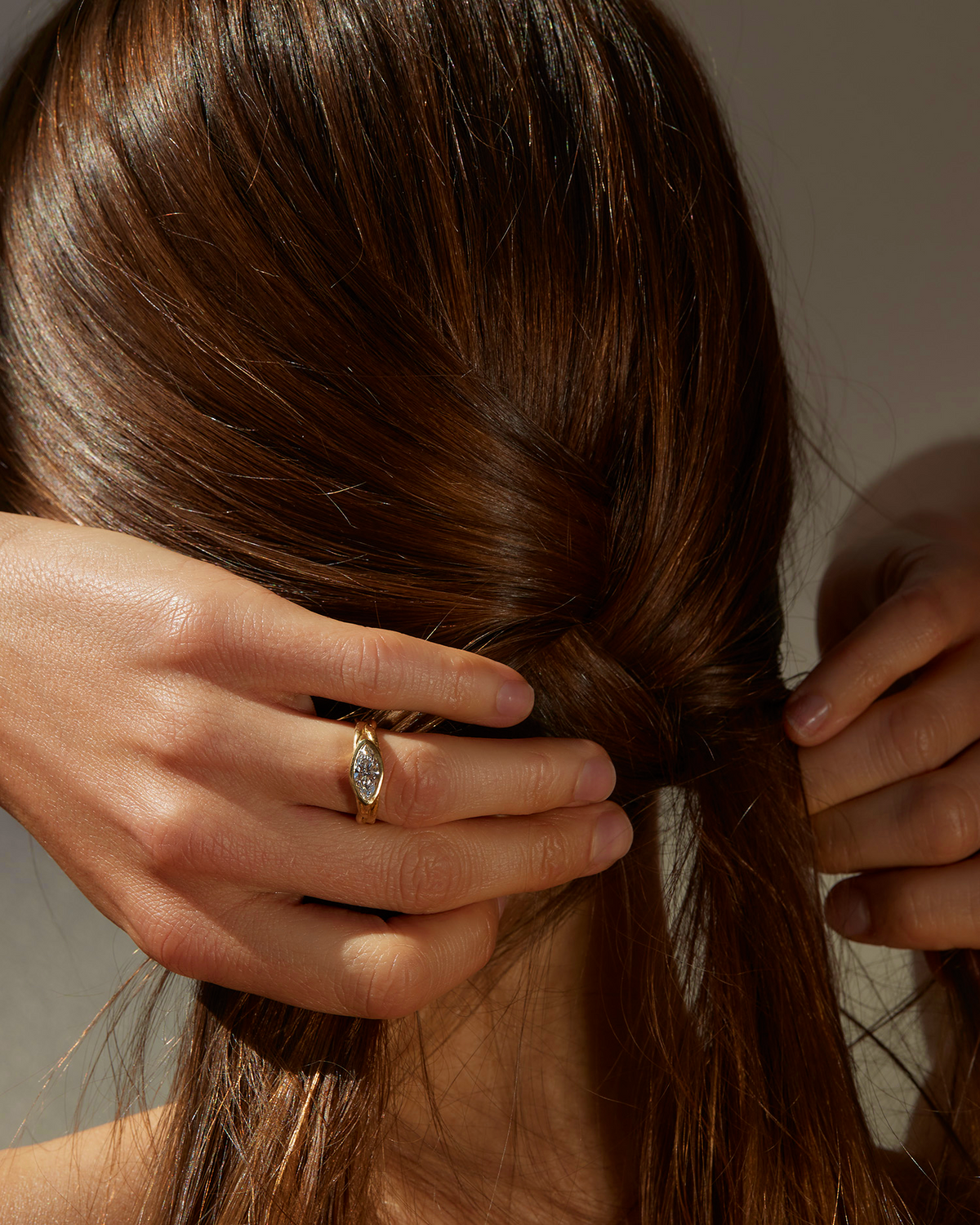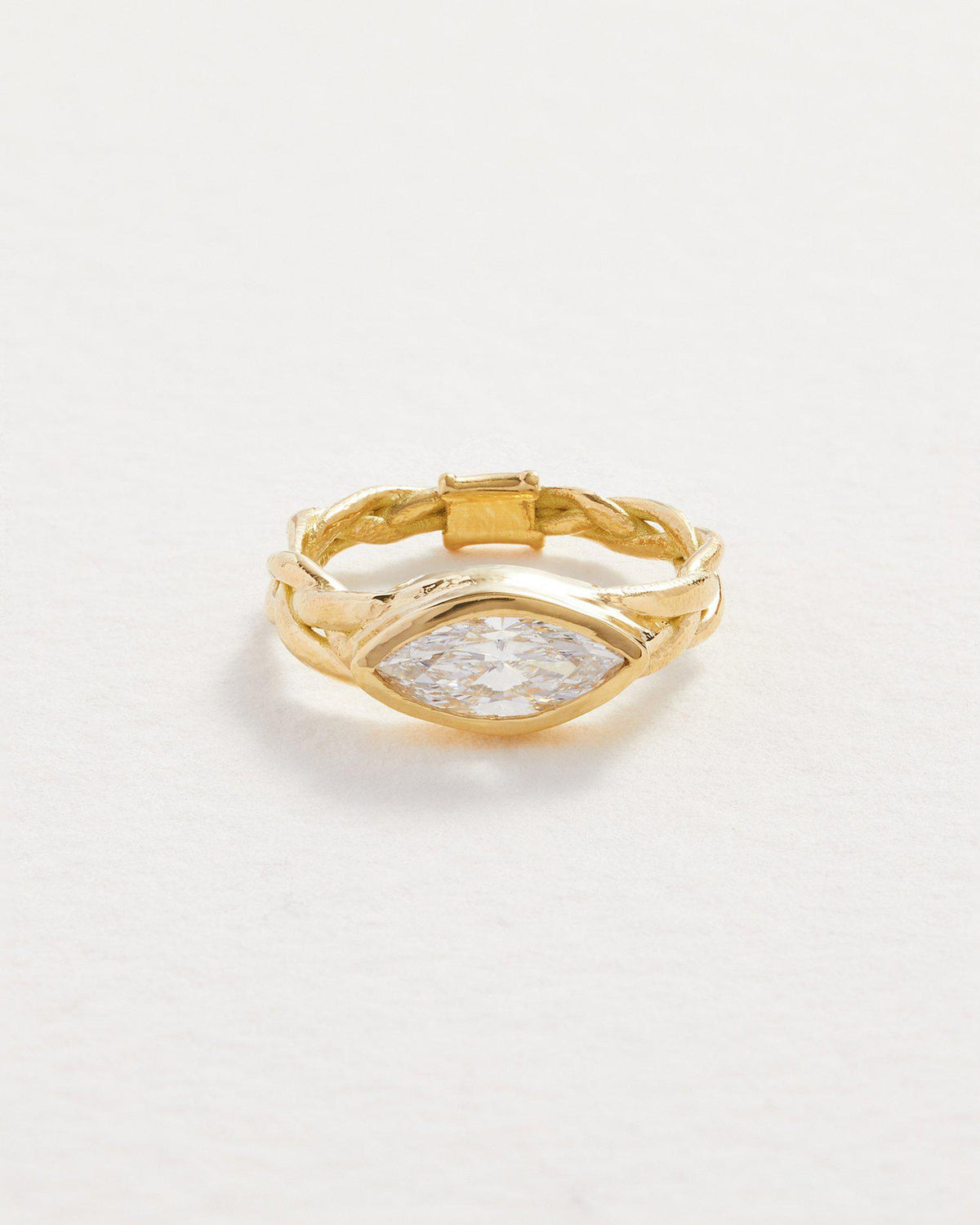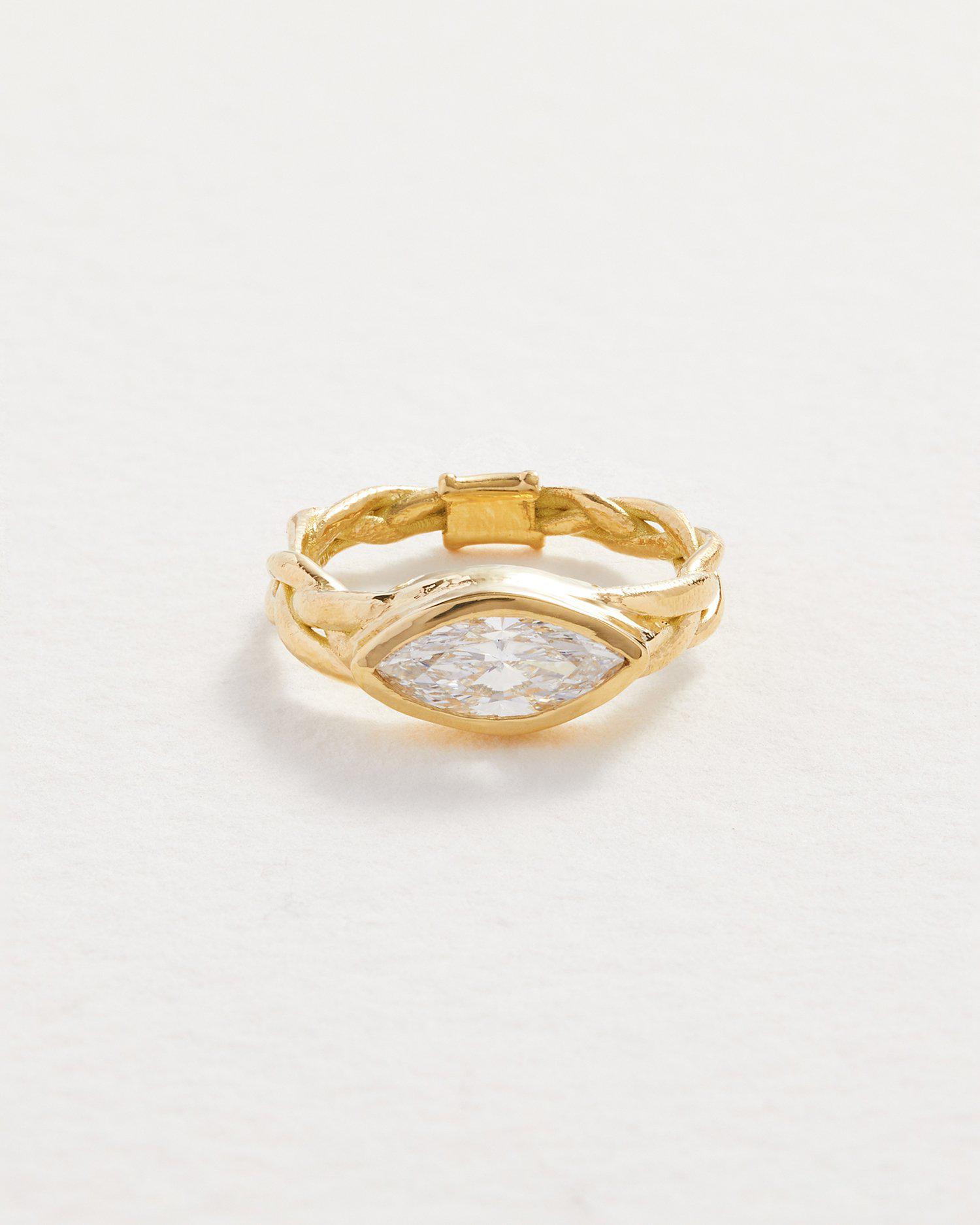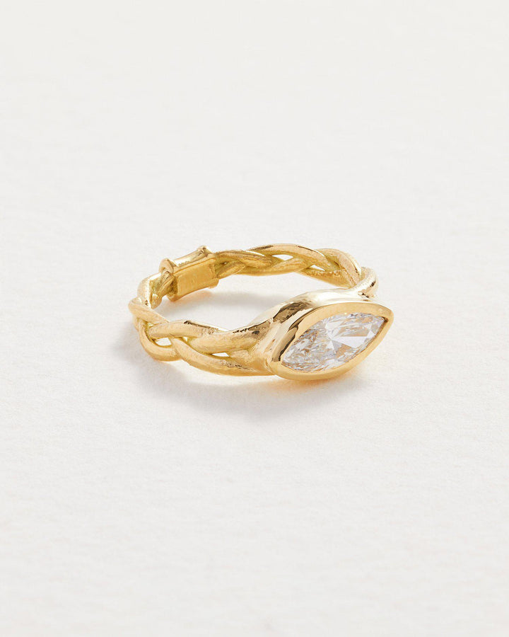 This Elektra Ring by Pamela Love is a refined yet organic statement of love. A sophisticated marquise-cut diamond is nestled within a delicate, loosely braided gold band, exuding a timeless, ancient-inspired allure.