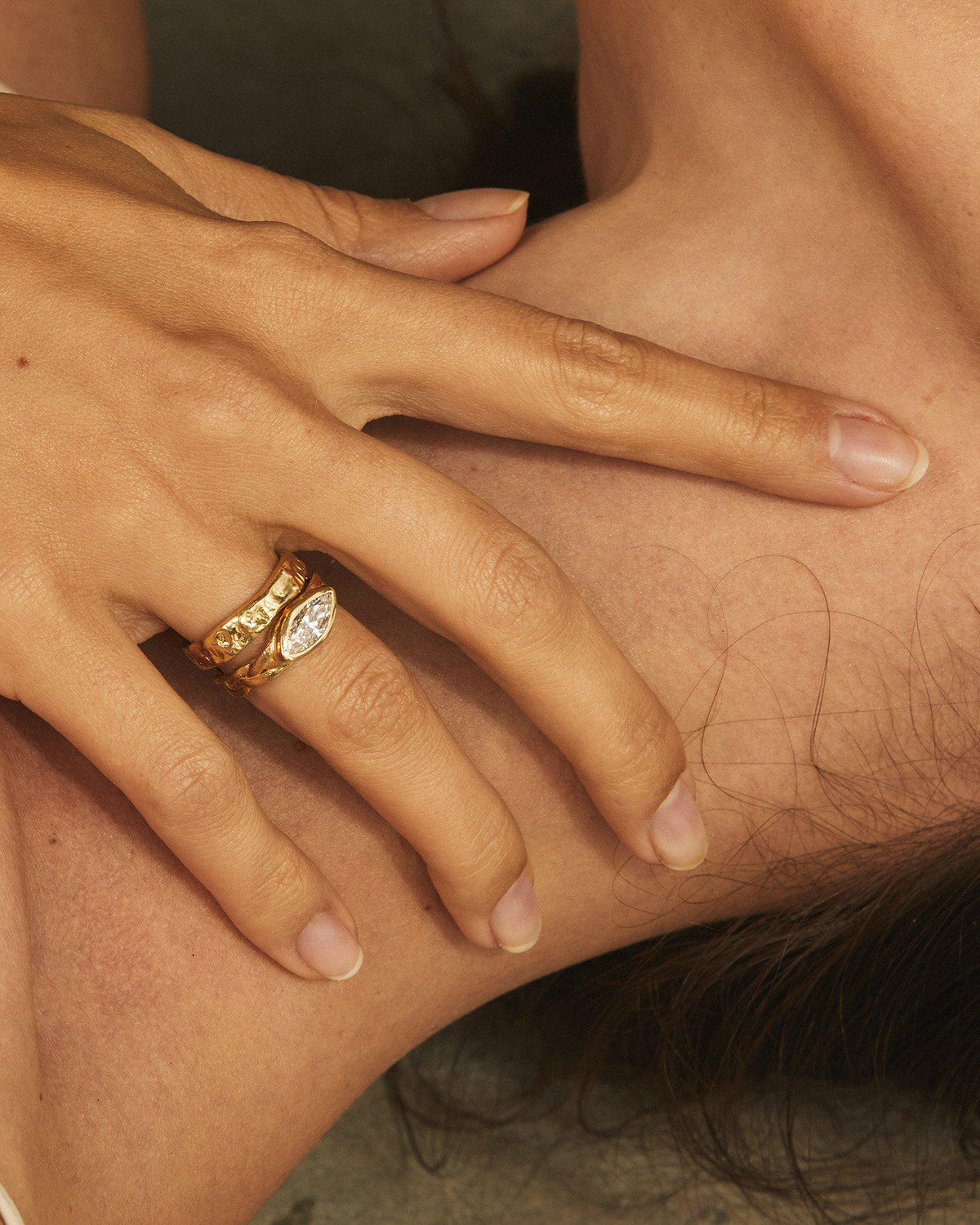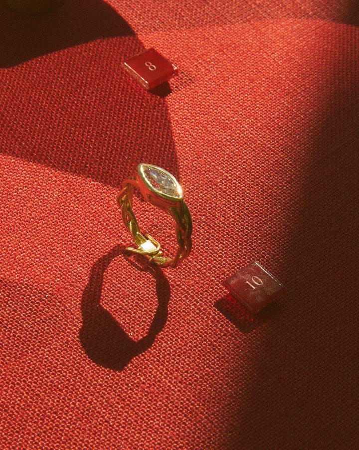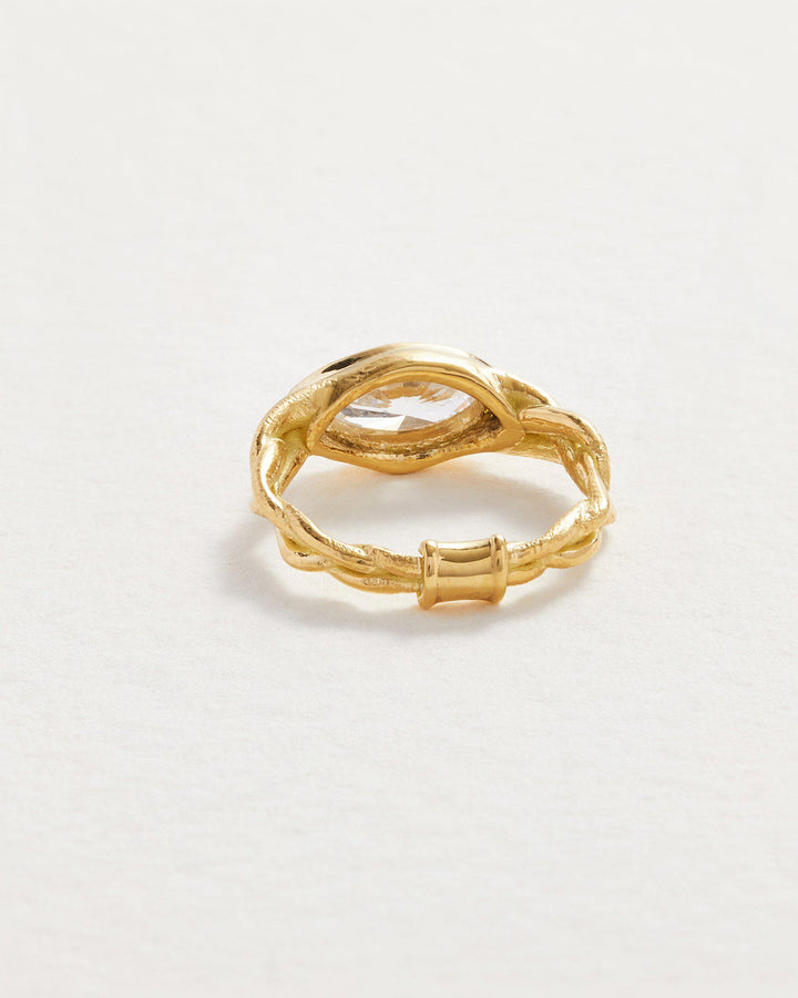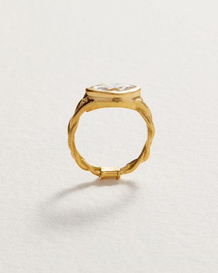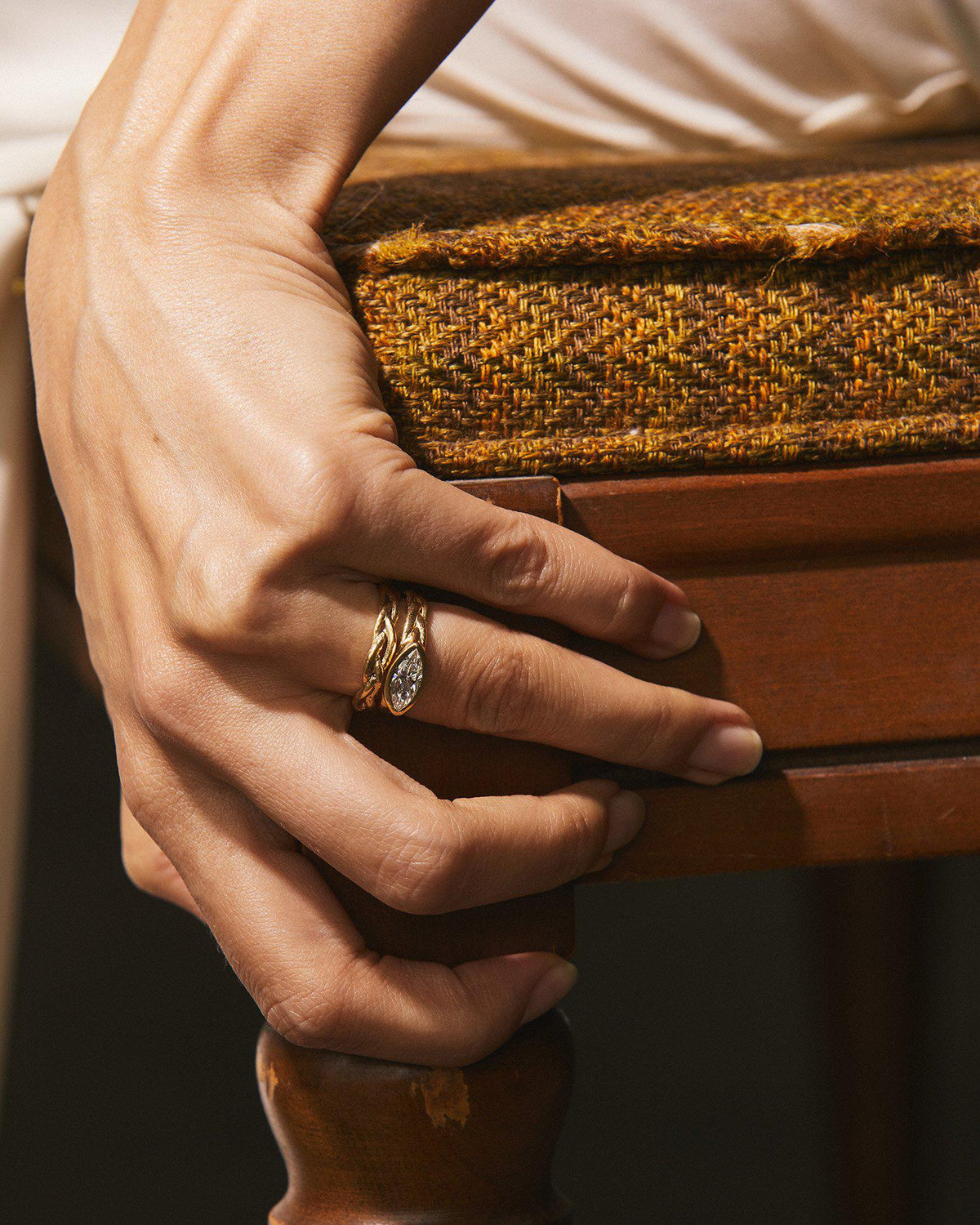 This Elektra Ring by Pamela Love is a refined yet organic statement of love. A sophisticated marquise-cut diamond is nestled within a delicate, loosely braided gold band, exuding a timeless, ancient-inspired allure.