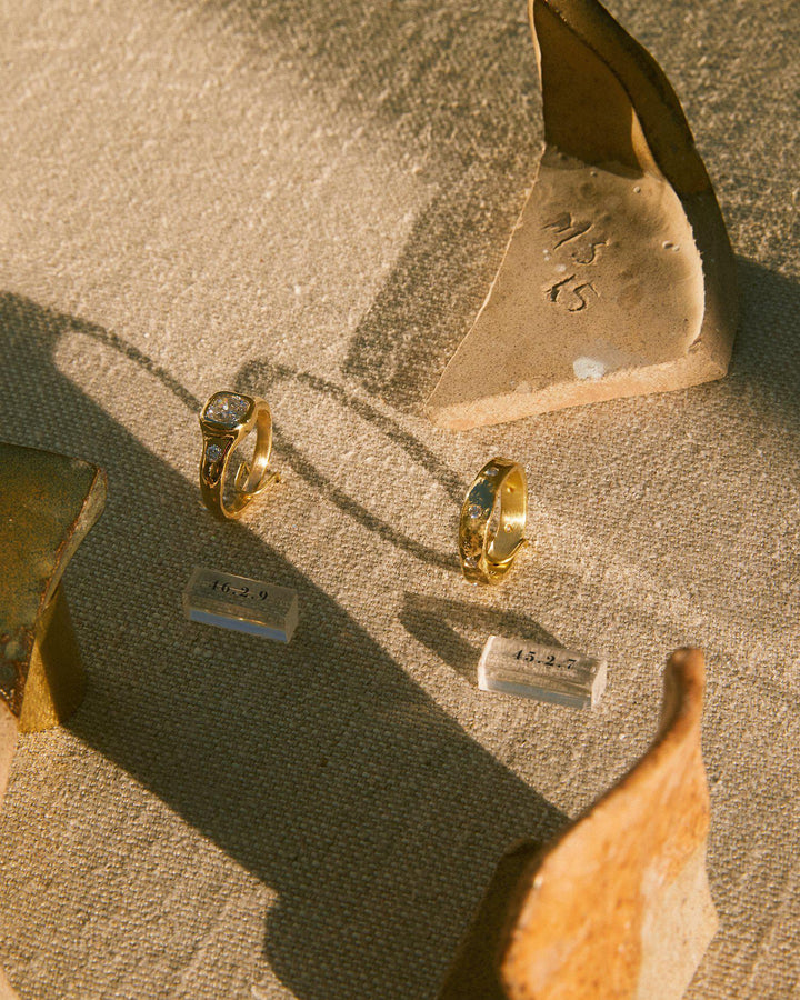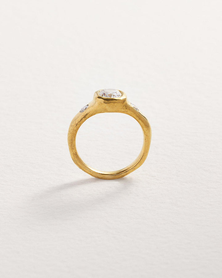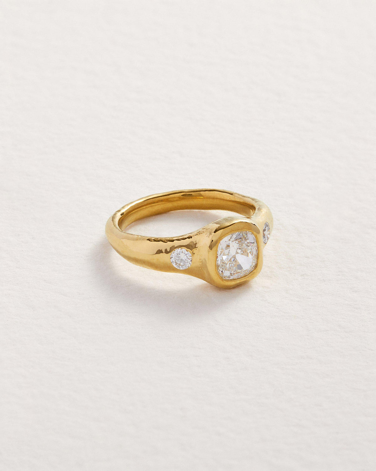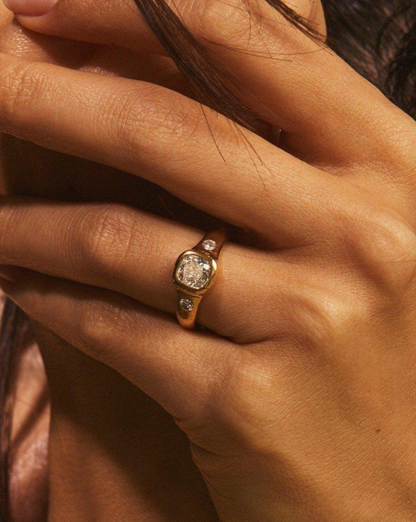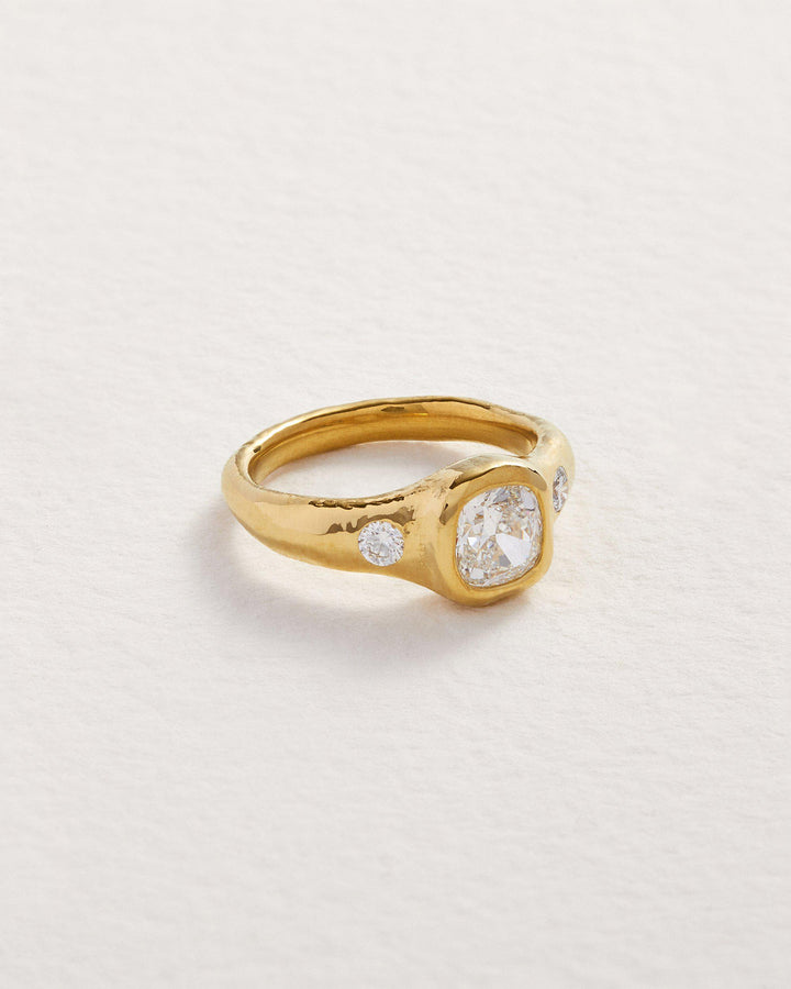 This Astraea Ring by Pamela Love balances structure with fluidity. A luminous cushion-cut diamond is set in a raw, organic-textured gold band, accented with two additional diamonds for a celestial effect.