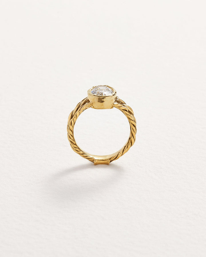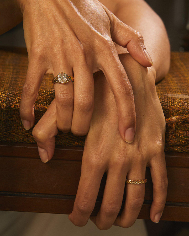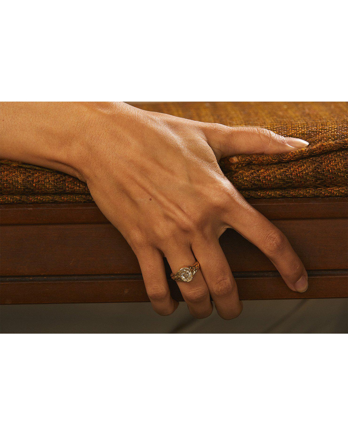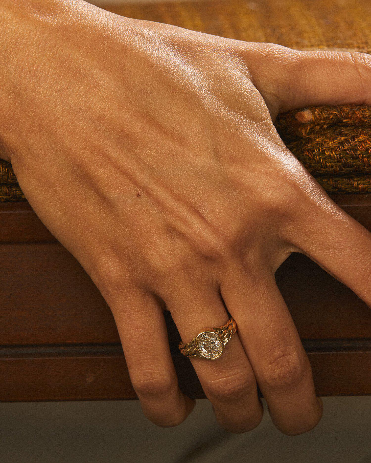 This Calliope Ring by Pamela Love is a poetic celebration of connection. A brilliant-cut diamond sits in a molten bezel setting, surrounded by an intricately braided gold band. The woven texture signifies unity and strength, making it a meaningful ceremonial piece.