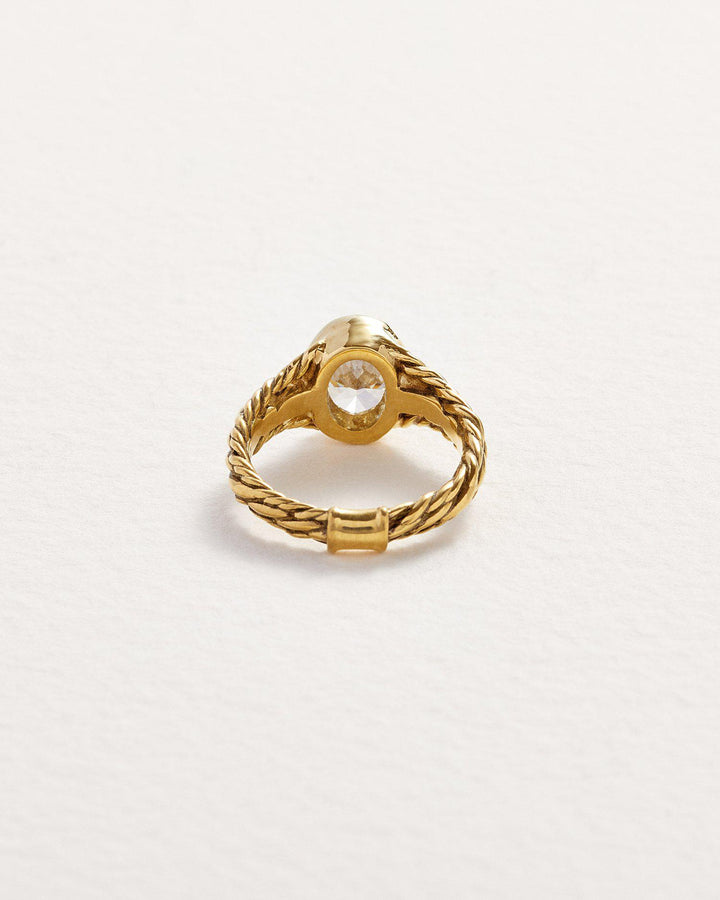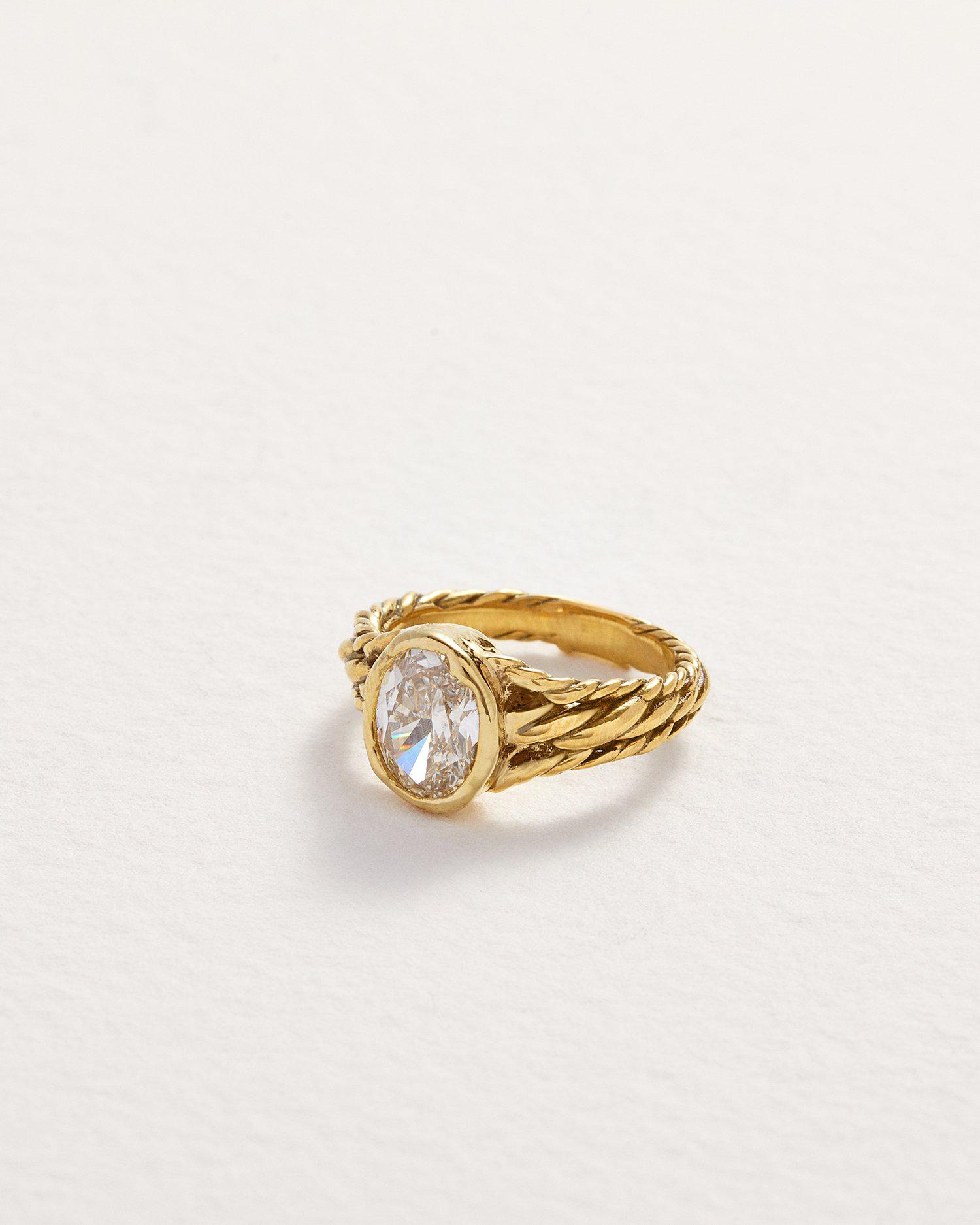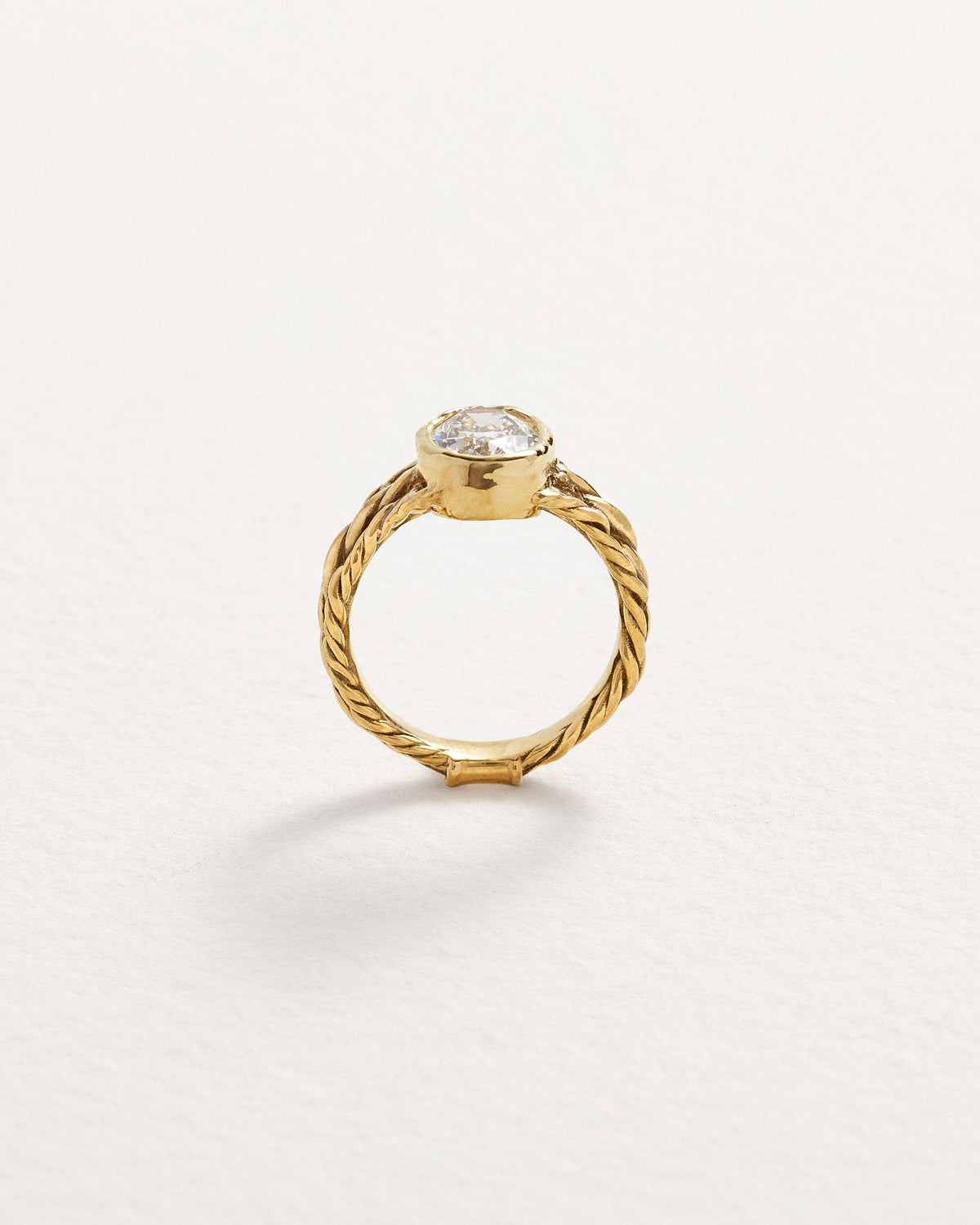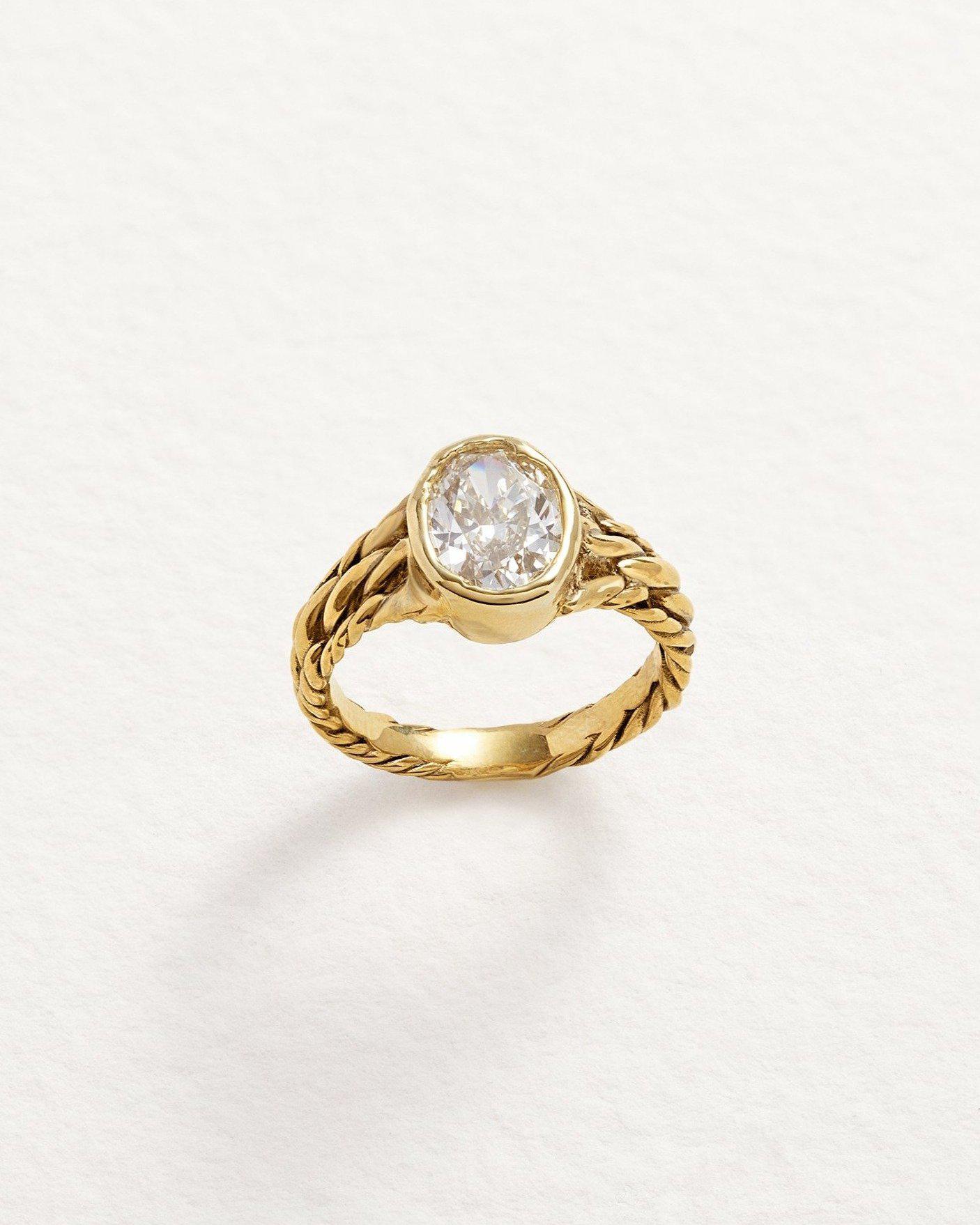 This Calliope Ring by Pamela Love is a poetic celebration of connection. A brilliant-cut diamond sits in a molten bezel setting, surrounded by an intricately braided gold band. The woven texture signifies unity and strength, making it a meaningful ceremonial piece.