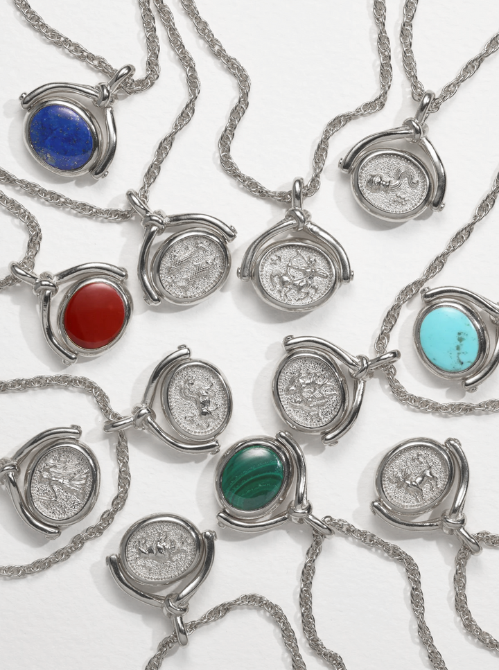 This Taurus Spinner Pendant by Pamela Love is a grounding talisman for the determined and steadfast Taurus. The two-sided pendant features the Taurus zodiac symbol on one side and a lush green malachite coin on the other, representing Taurus’s deep connection to the Earth, stability, and sensuality.
