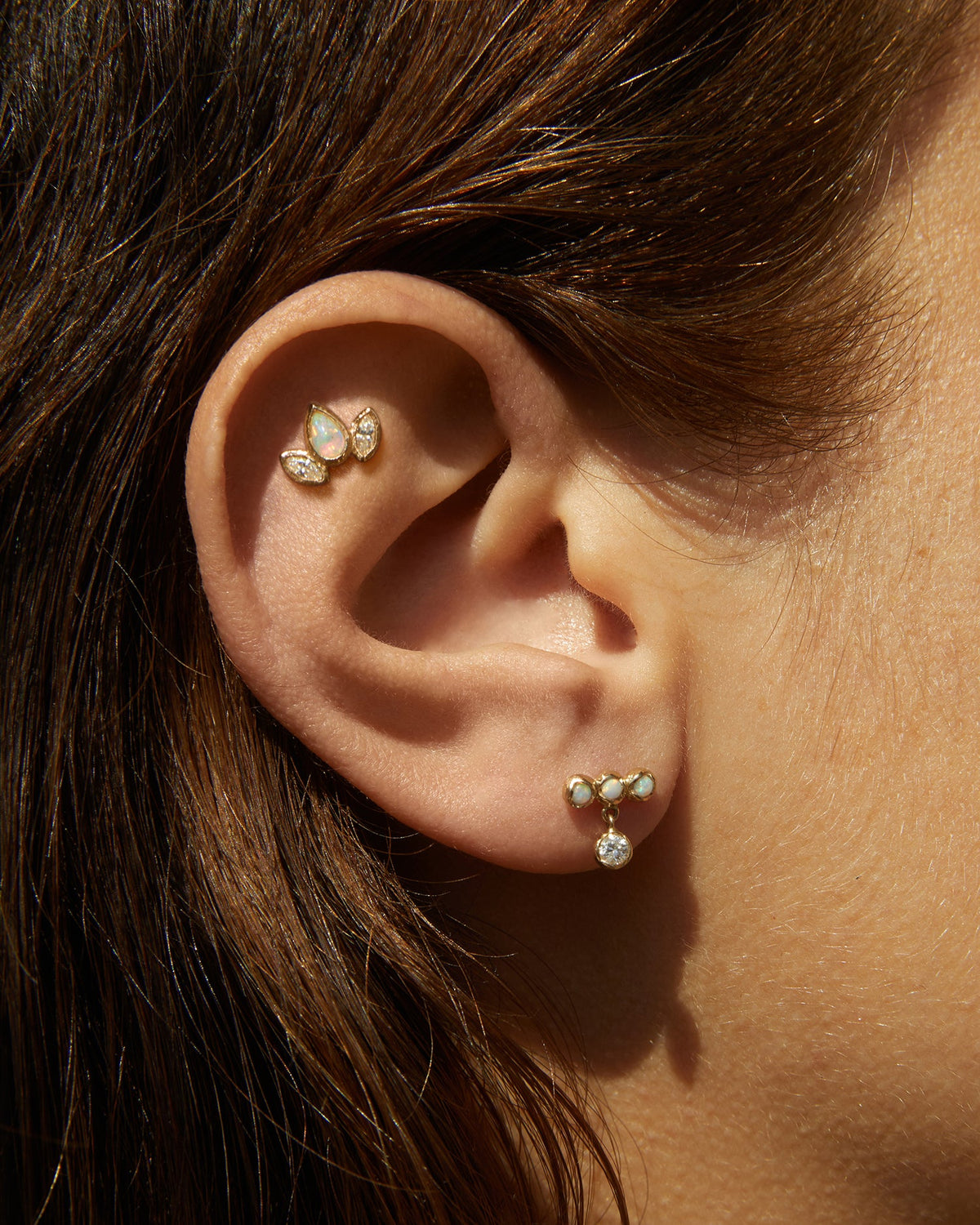 These Molten Bar Drop Studs by Pamela Love create a striking balance of movement and form. A trio of gleaming opals set in a crossbar supports a suspended diamond, all encased in molten gold. The design evokes celestial beauty with a refined edge, making it a standout addition to any ear stack. Sold as a single.