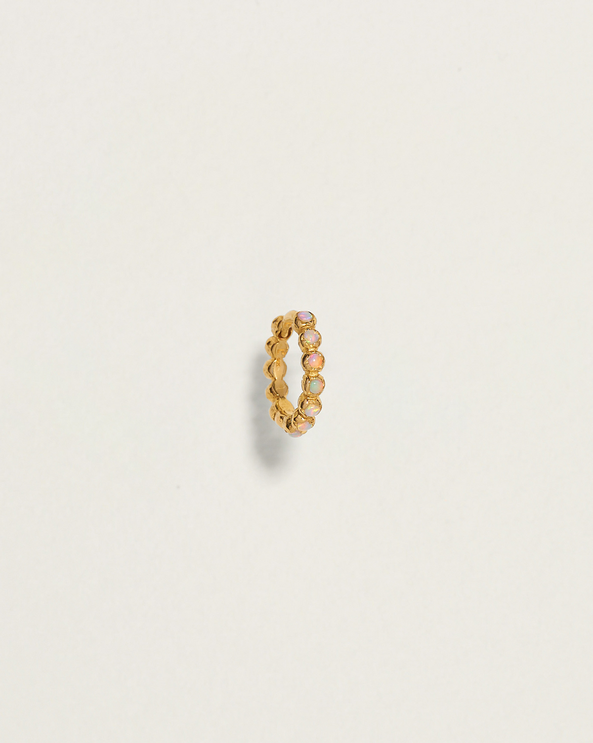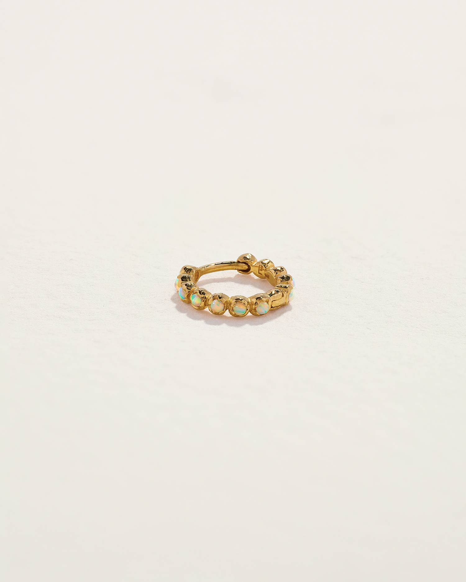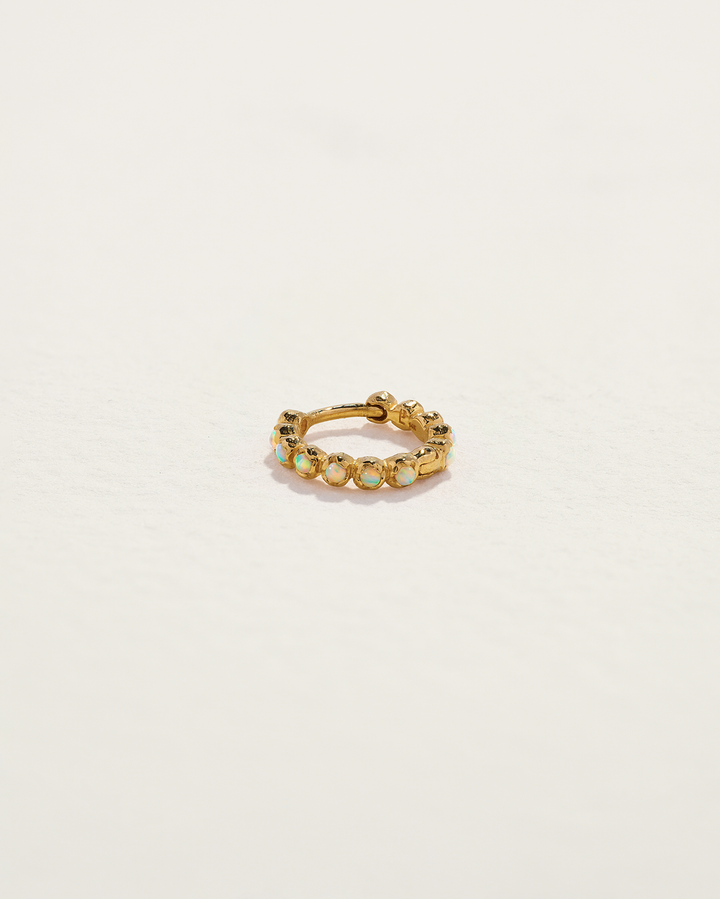 Handcrafted in 14k yellow gold with opal cabochons. Huggie measures 8mm in inner diameter and 1.5mm in width, crafted in 19-gauge thickness. Secured with a hinge mechanism and clicker closure for ease of wear.