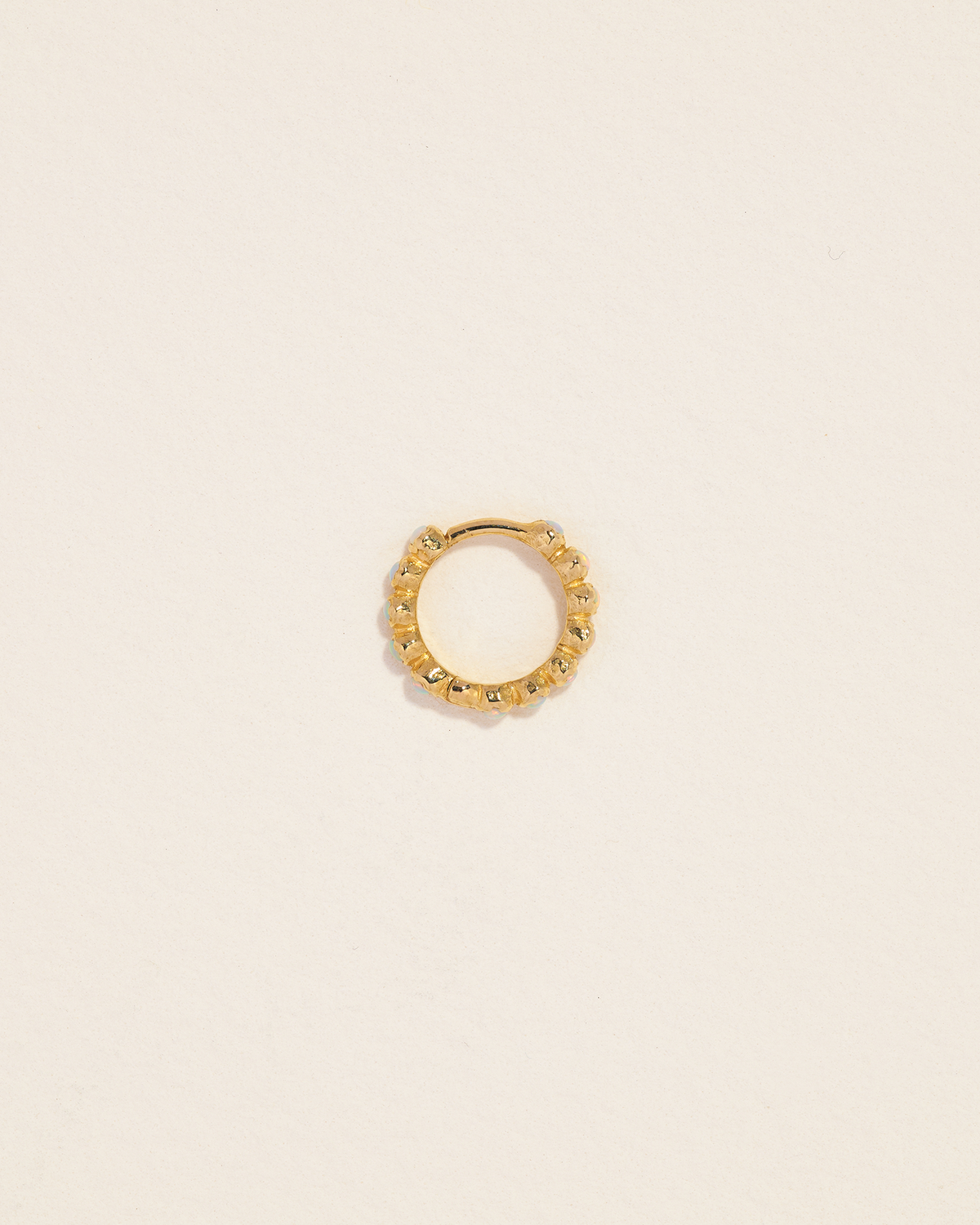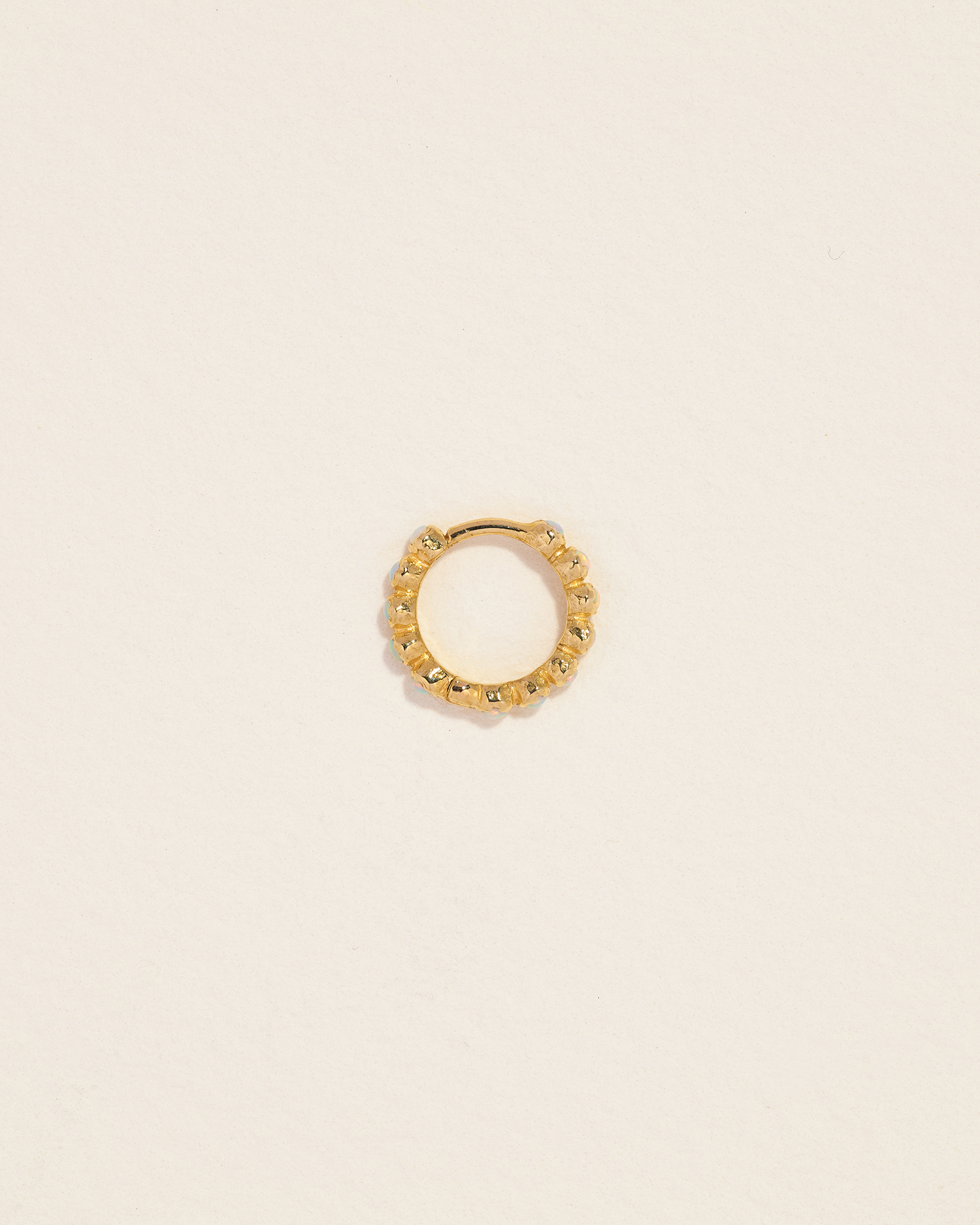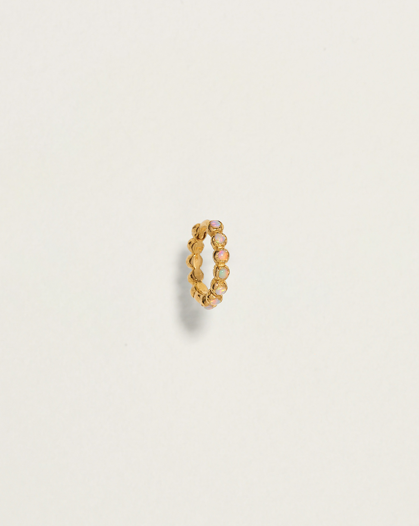 Handcrafted in 14k yellow gold with opal cabochons. Huggie measures 8mm in inner diameter and 1.5mm in width, crafted in 19-gauge thickness. Secured with a hinge mechanism and clicker closure for ease of wear.