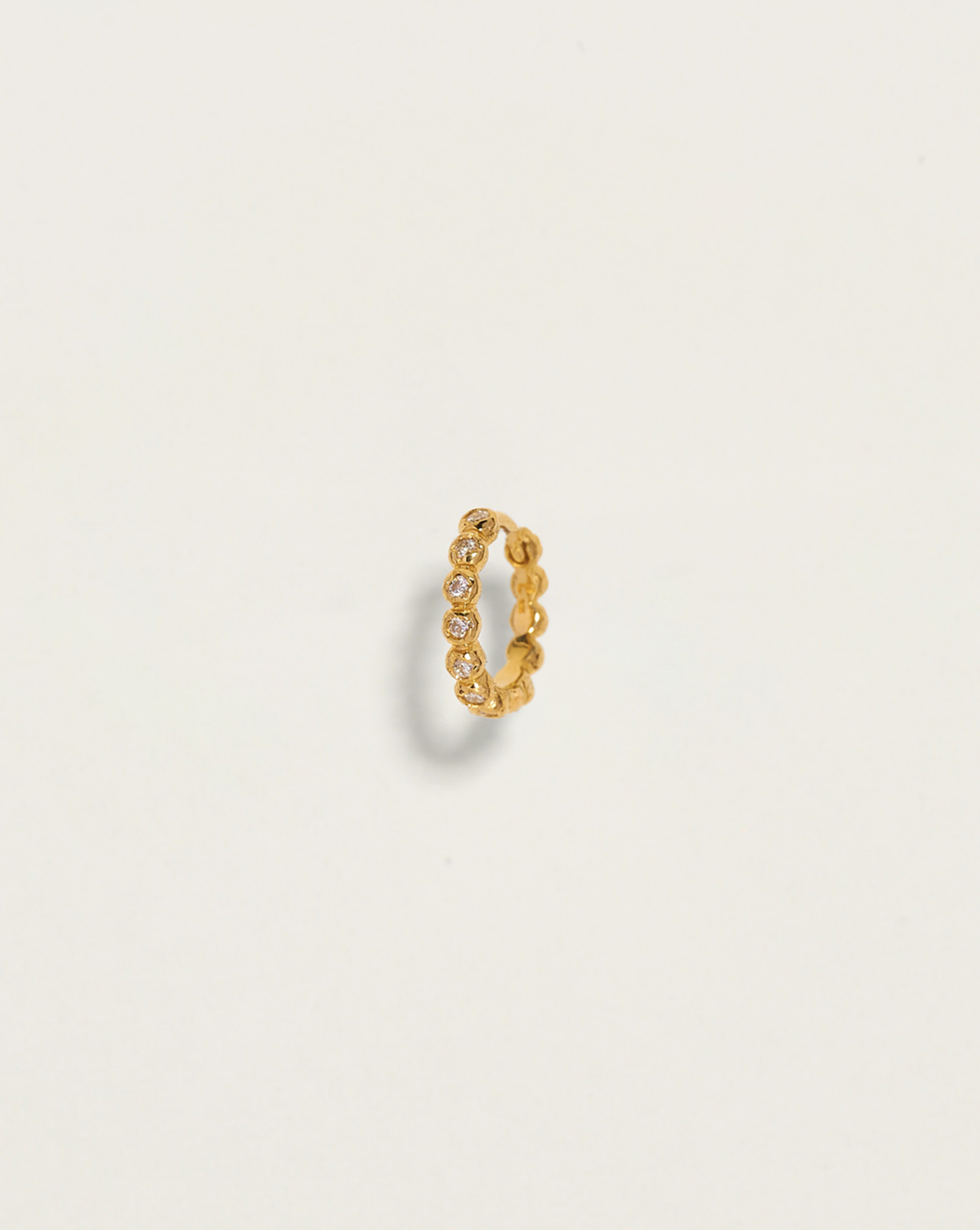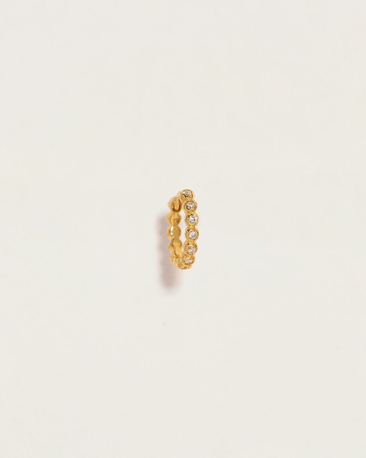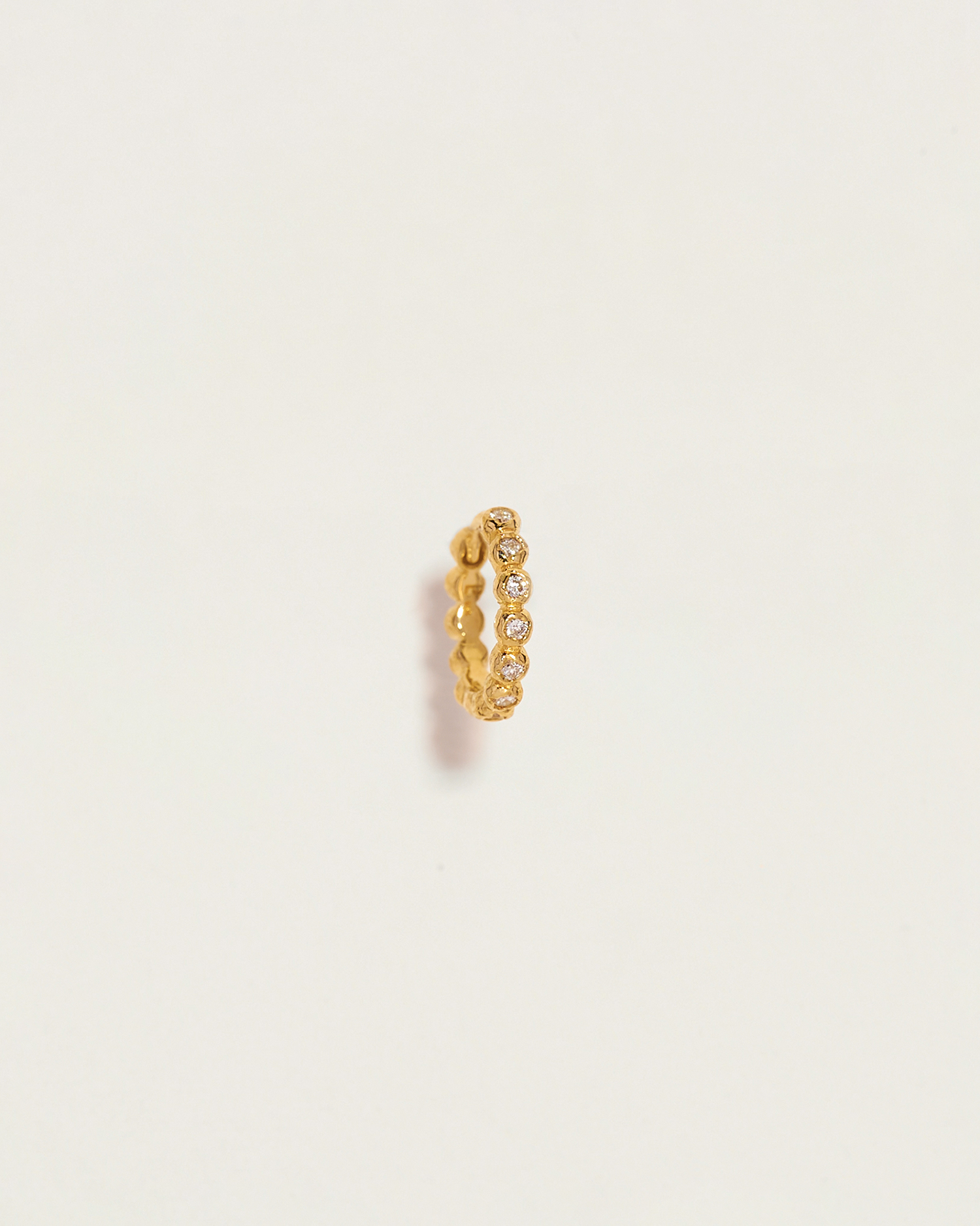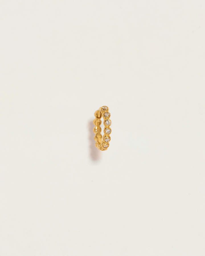 These 8mm Molten Eternity Huggies by Pamela Love feature bezel-set diamonds nestled between sculptural molten gold droplets, creating a seamless and elegant infinity-inspired design. The interplay of texture and brilliance makes this piece an exquisite addition to any curated ear stack. Sold as a single.