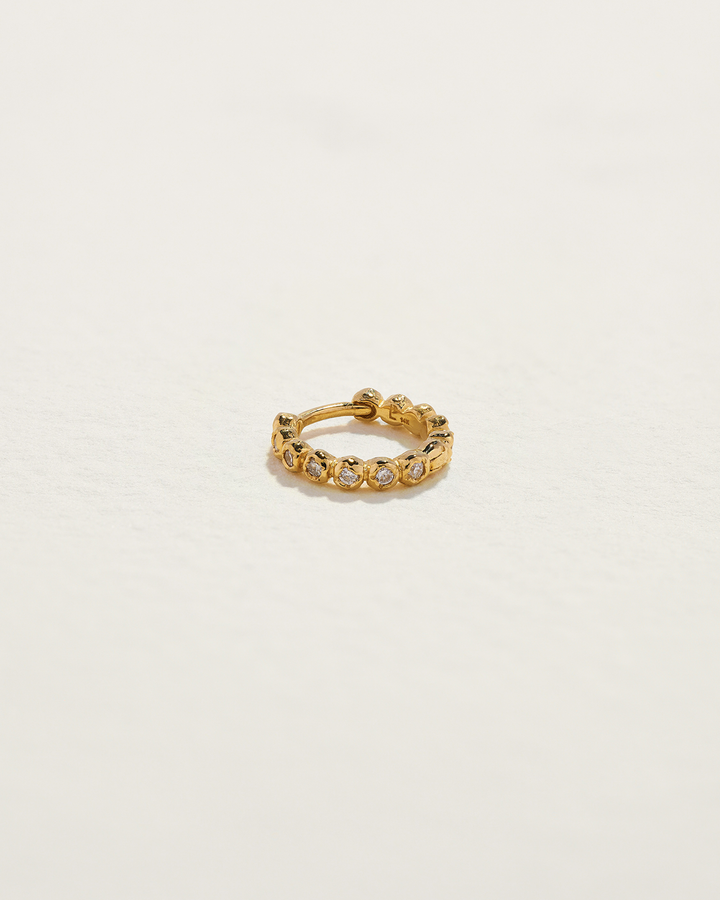 Handcrafted in 14k yellow gold with bezel-set white diamonds. Huggie measures 8mm in inner diameter and 1.5mm in width, crafted in 19-gauge thickness. Secured with a hinge mechanism and clicker closure for ease of wear.