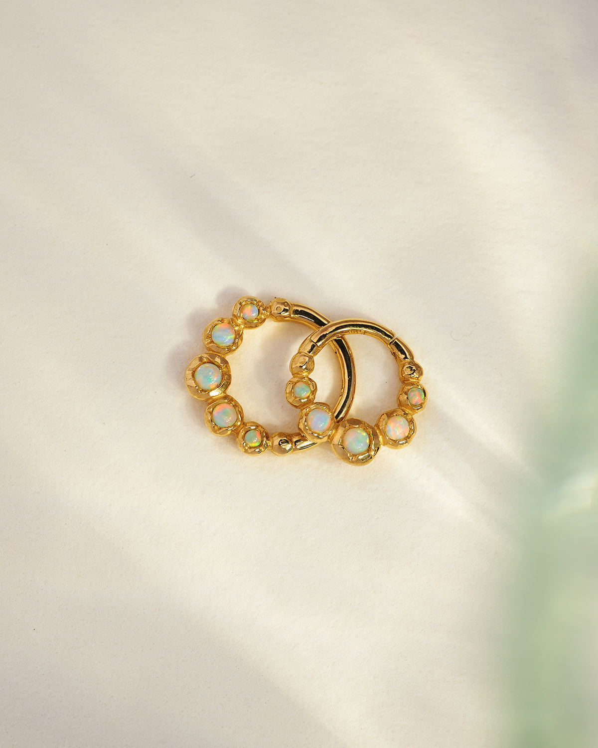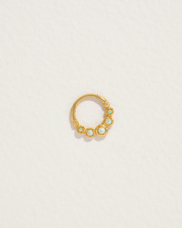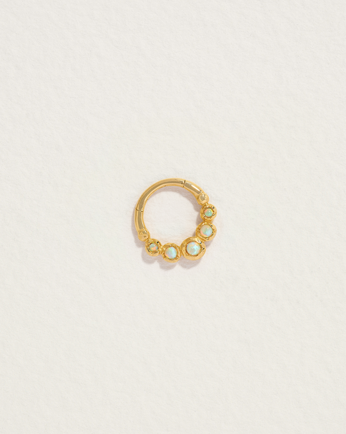 These 8mm Molten Clickers by Pamela Love echo celestial beauty, featuring a seamless row of glowing bezel-set opal cabochons encased in molten gold. The ethereal design enhances any ear stack with a soft, luminous glow. Sold as a single.
