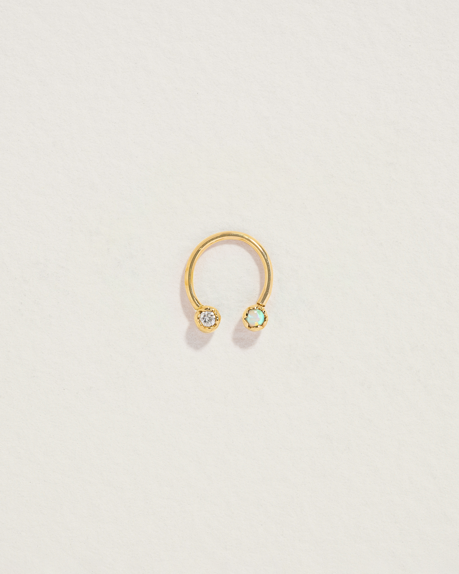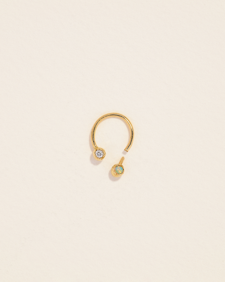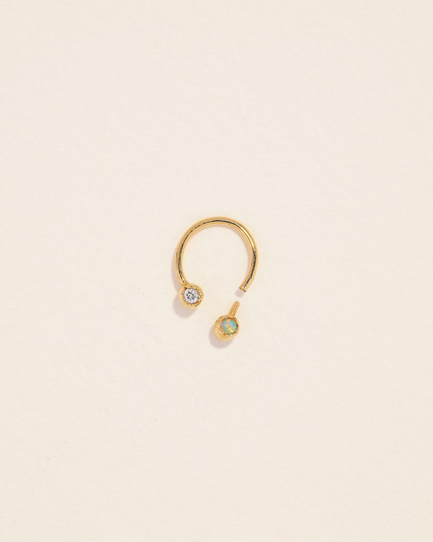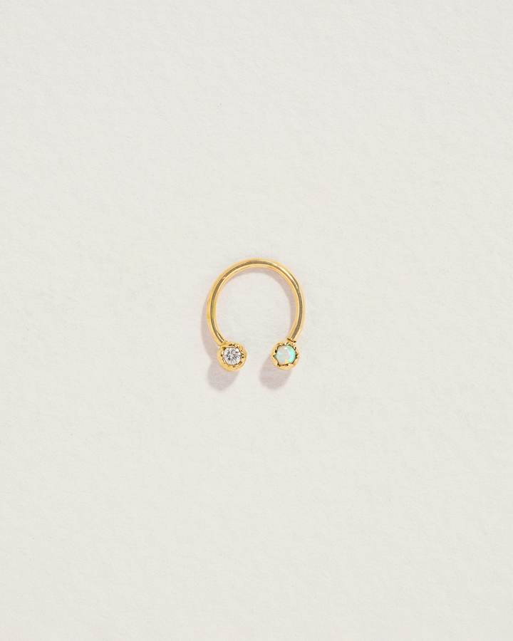These Circular Barbells by Pamela Love bring together the celestial glow of opal and the timeless sparkle of diamonds, set within a sleek 14k gold frame. The contrast between fire and brilliance makes this an exceptional choice for curated ear styling. Sold as a single.