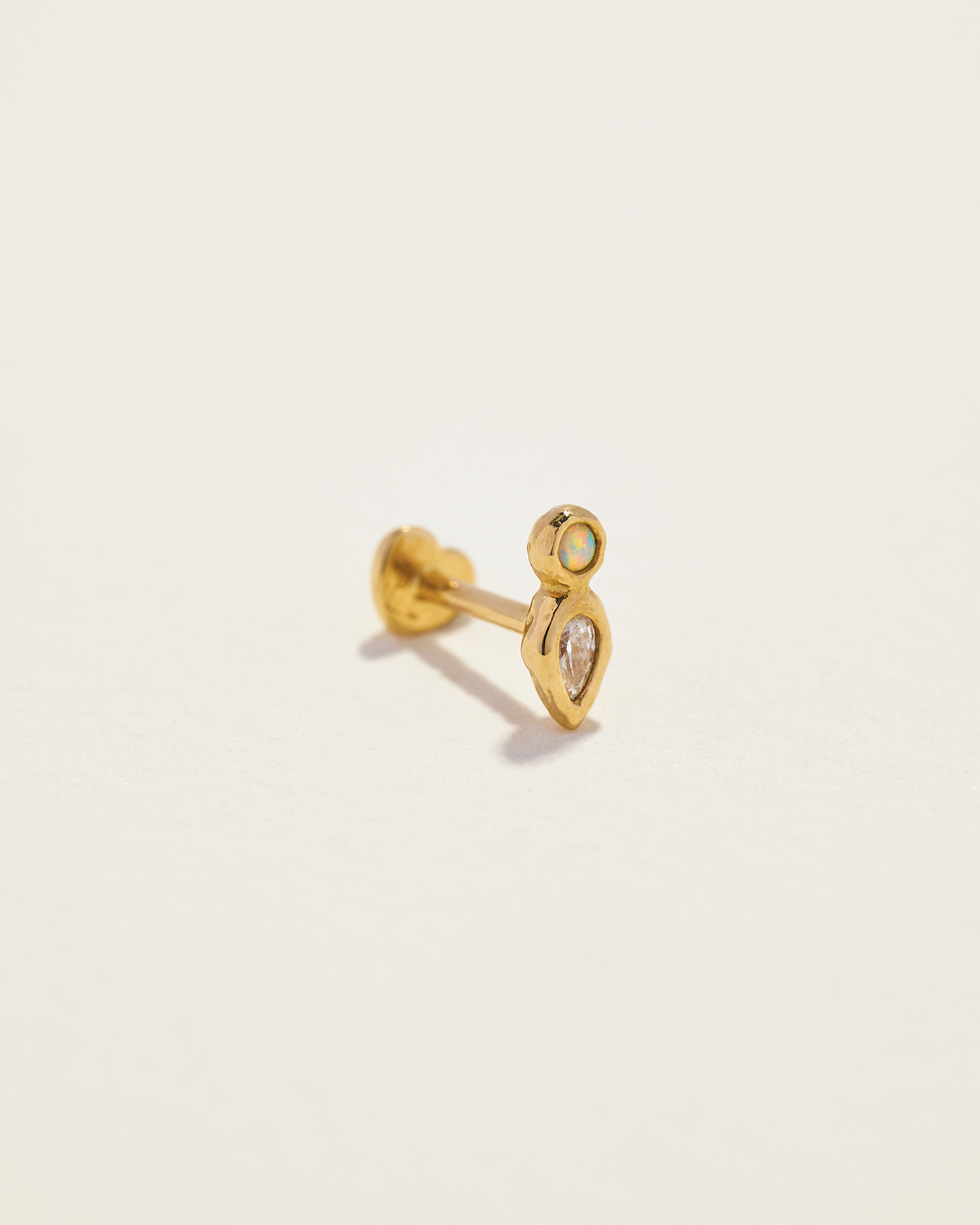 Handcrafted in 14k yellow gold with a bezel-set white diamond and opal cabochon. Stud measures 7mm in length, crafted in 16-gauge thickness. Secured with an internally threaded heart-shaped ball back.